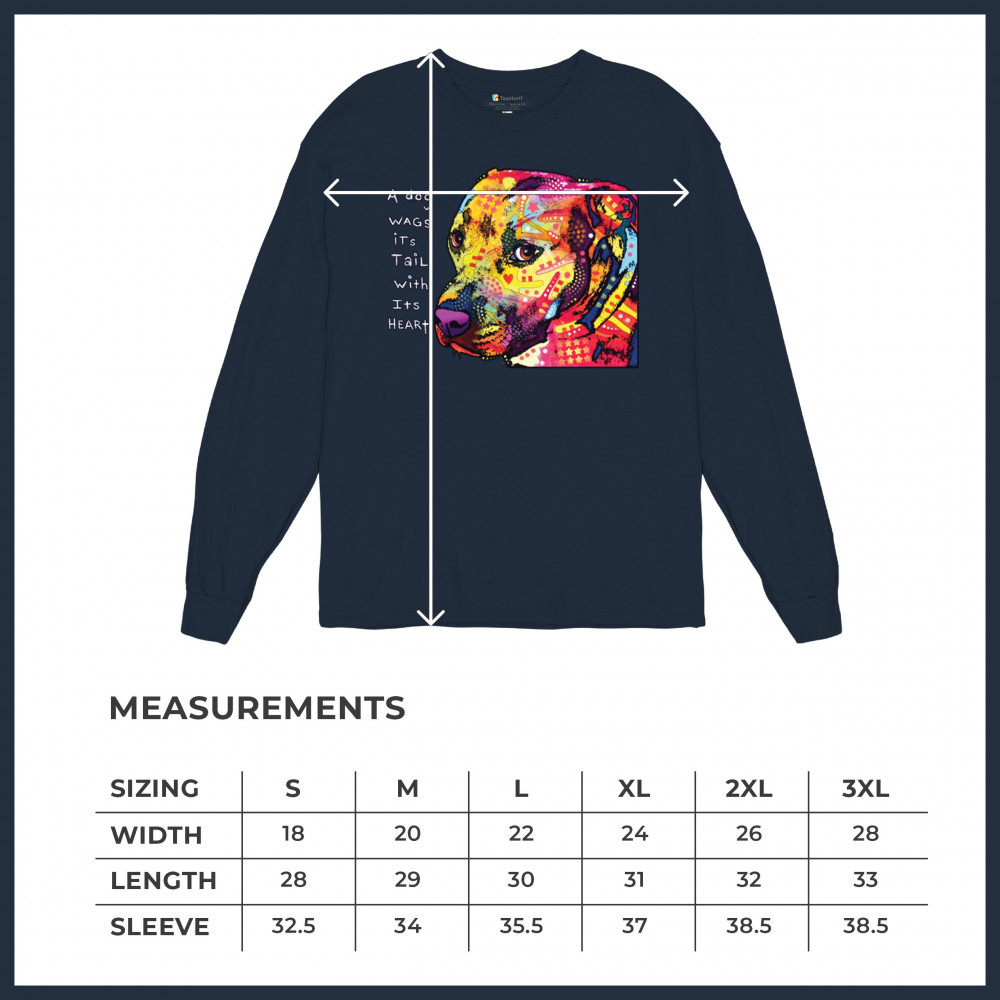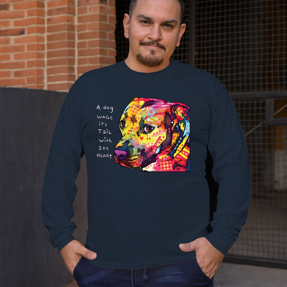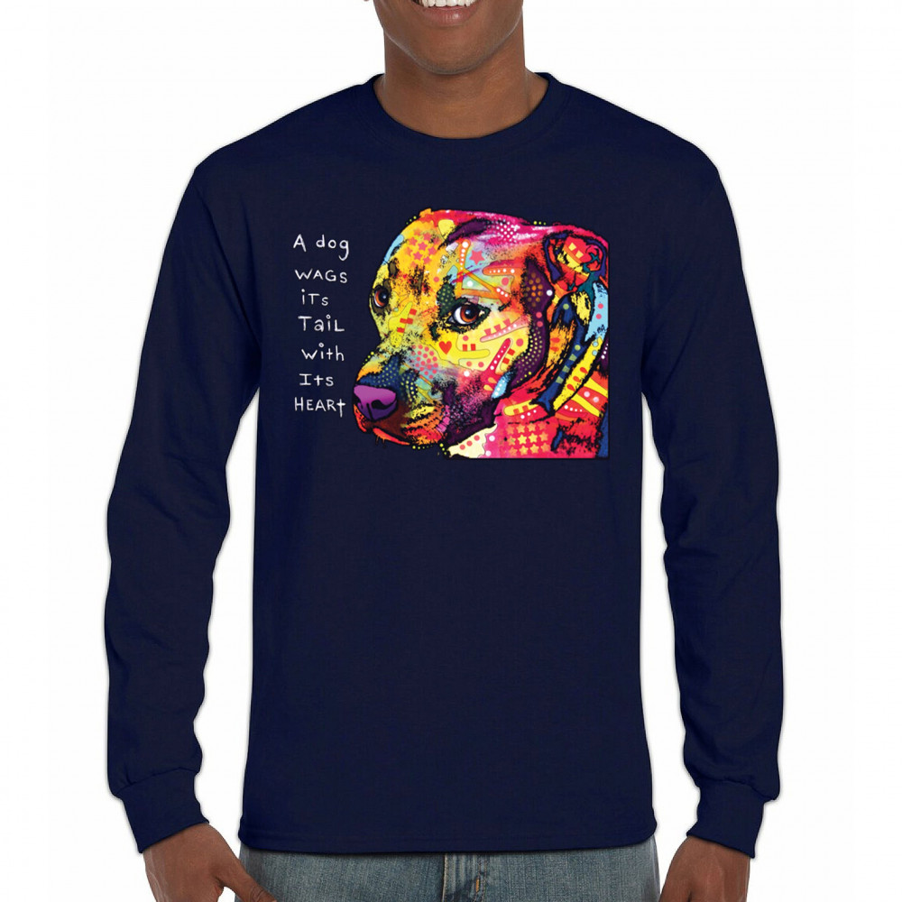DEAN RUSSO PIT BULL long sleeve t-shirt dog wags its tail with its heart navy blue