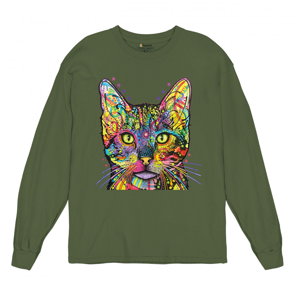 DEAN RUSSO SHIVA CAT STARE long sleeve t-shirt neon mosaic colorful kitten eyes military green