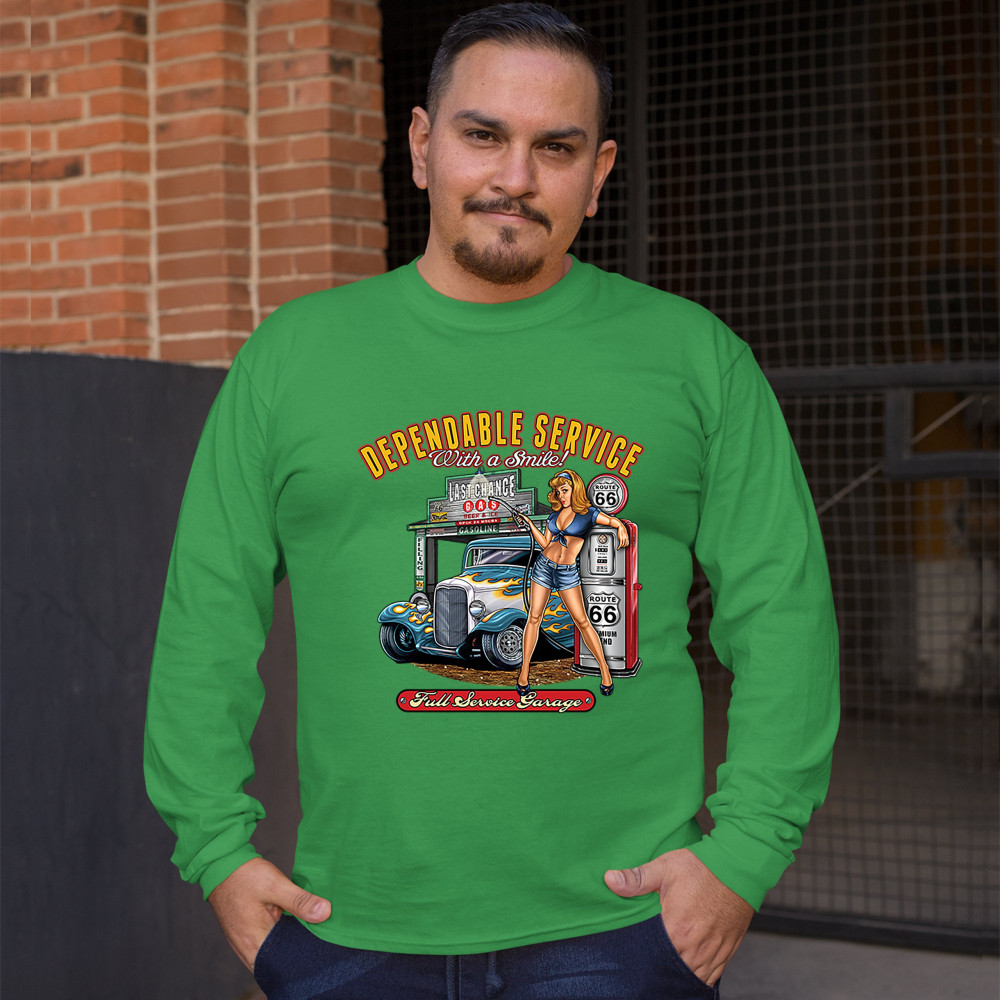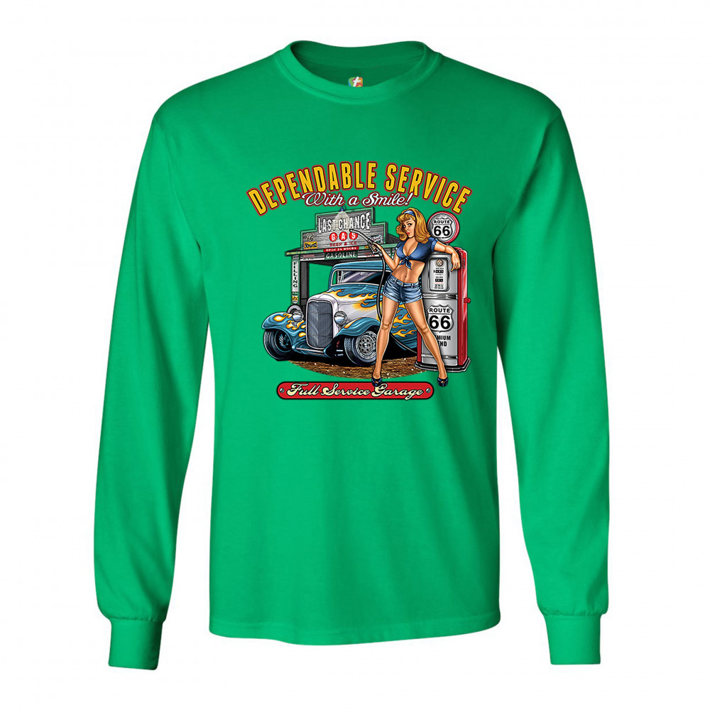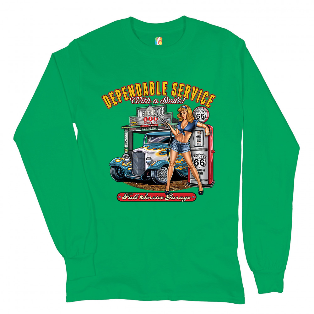 A print featuring a sexy pin-up girl standing by a gas pump with Route 66 signs on it. Behind her there is a garage with a hot rod parked at it. The print says: "Dependable Service With a Smile!" at the top and "Full Service Garage" at the bottom. A great