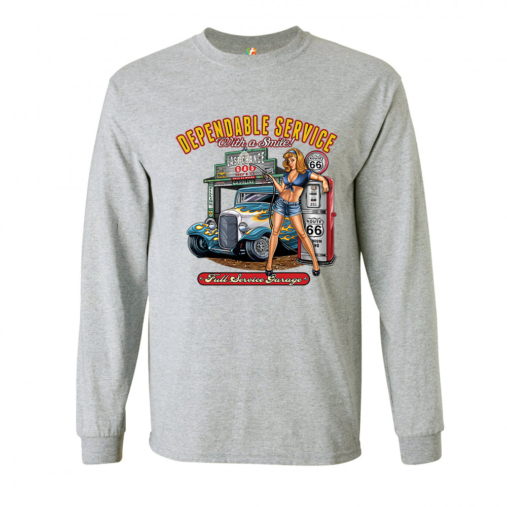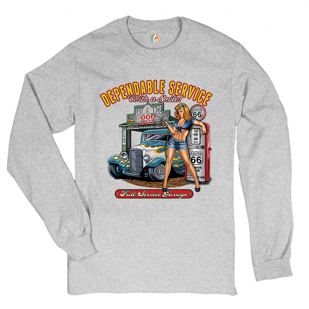 A print featuring a sexy pin-up girl standing by a gas pump with Route 66 signs on it. Behind her there is a garage with a hot rod parked at it. The print says: "Dependable Service With a Smile!" at the top and "Full Service Garage" at the bottom. A great