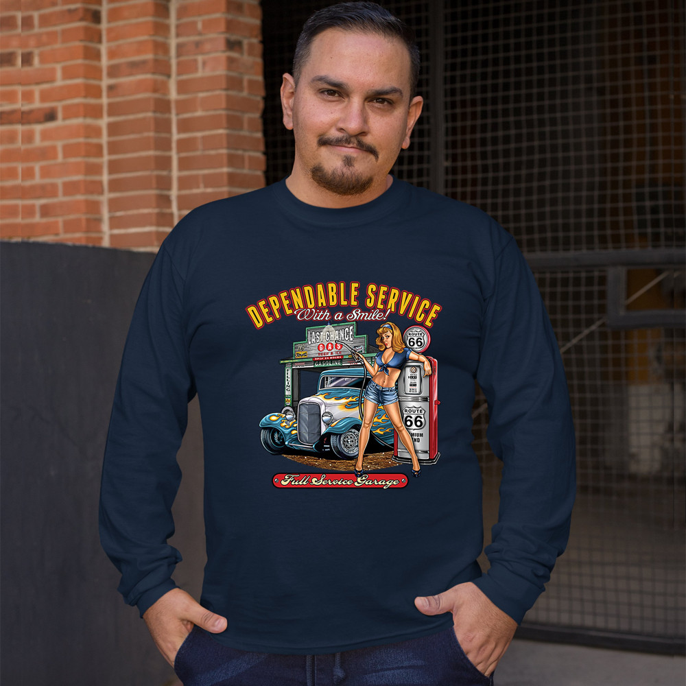 DEPENDABLE SERVICE long sleeve t-shirt route 66 hot rod full service garage navy blue