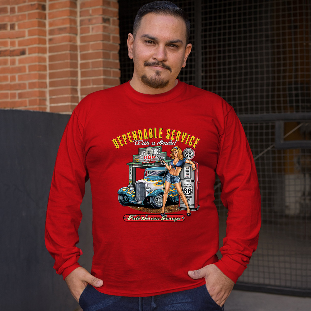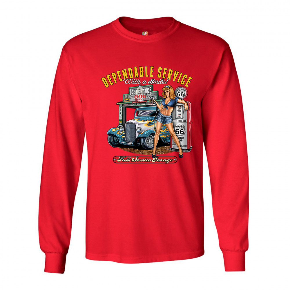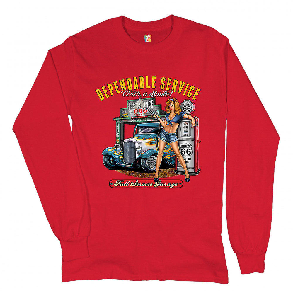 A print featuring a sexy pin-up girl standing by a gas pump with Route 66 signs on it. Behind her there is a garage with a hot rod parked at it. The print says: "Dependable Service With a Smile!" at the top and "Full Service Garage" at the bottom. A great