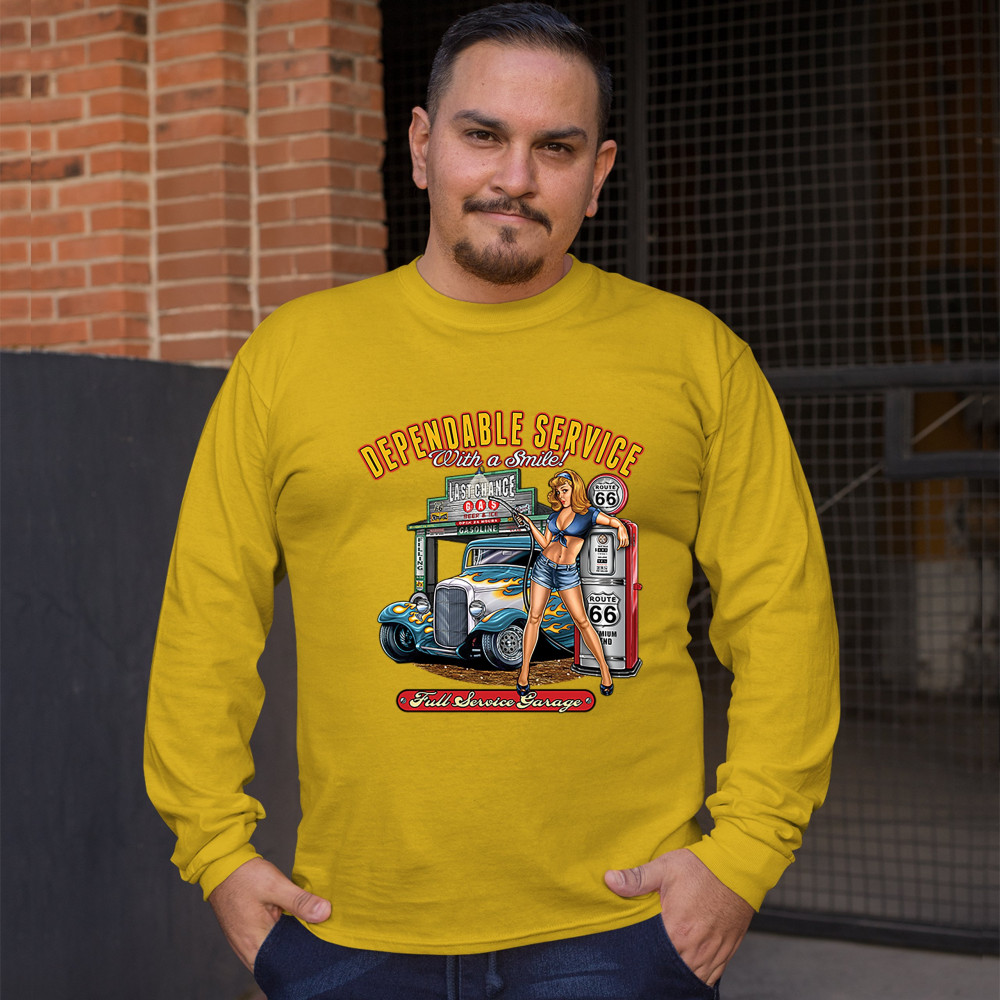 A print featuring a sexy pin-up girl standing by a gas pump with Route 66 signs on it. Behind her there is a garage with a hot rod parked at it. The print says: "Dependable Service With a Smile!" at the top and "Full Service Garage" at the bottom. A great