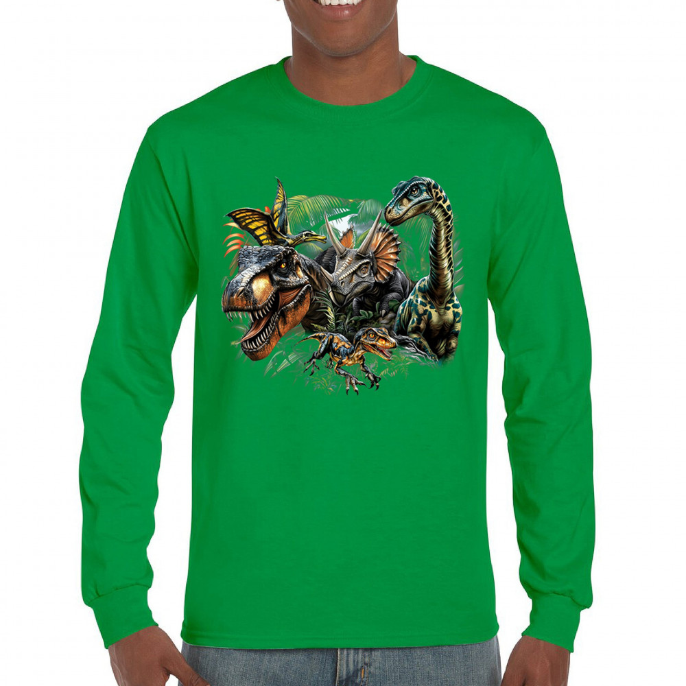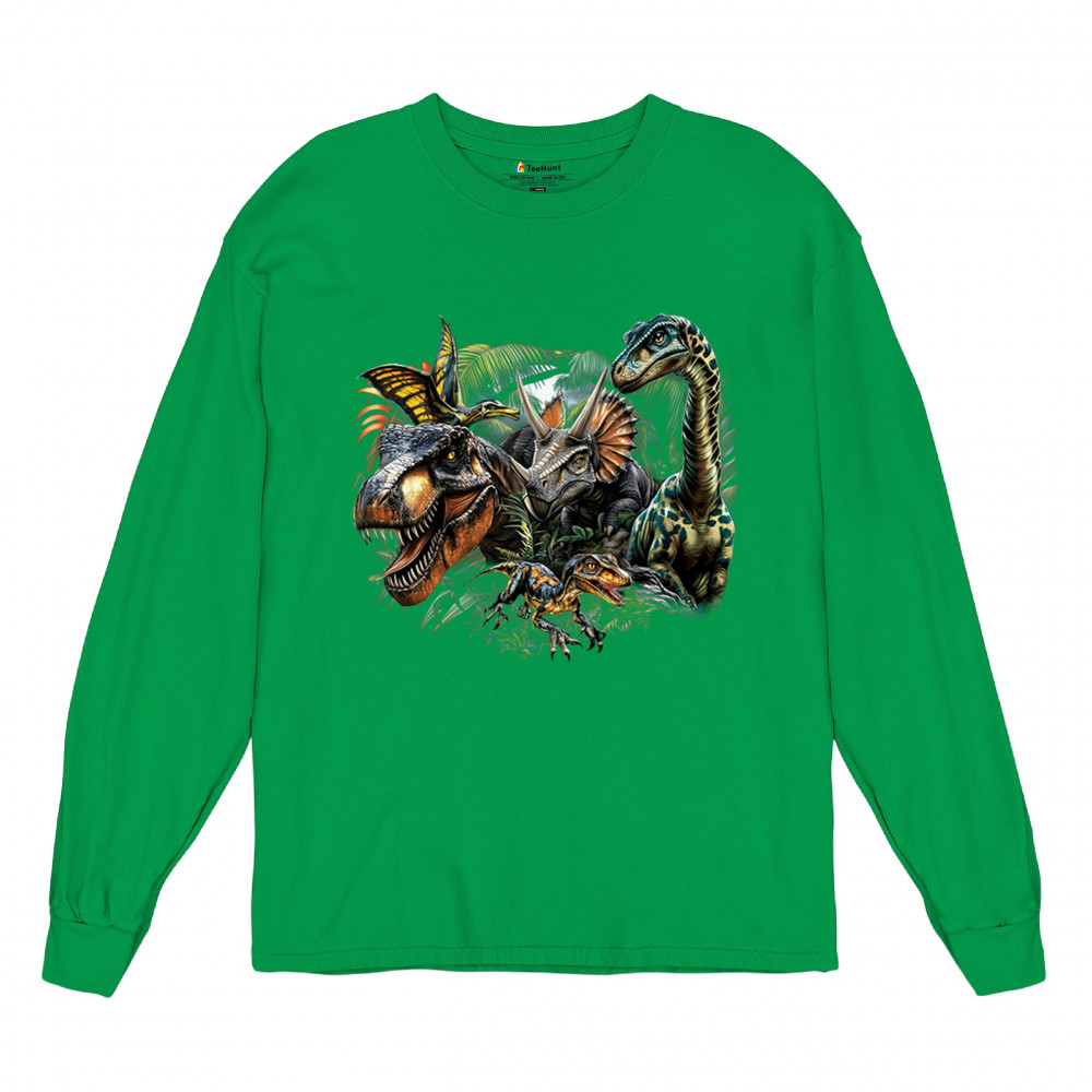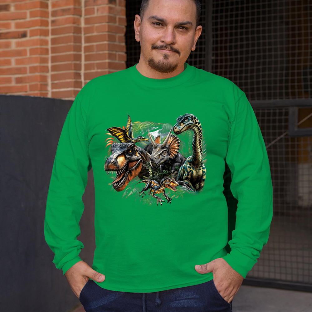 Get prehistoric with this electrifying design featuring a full dino squad in vibrant jungle detail. Includes t rex, triceratops, raptor, brachiosaurus, and pteranodon, all surrounded by tropical foliage. A perfect pick for dinosaur fans, fossil hunters, Jurassic birthday parties, or anyone who loves bold, wild, nature-themed art.