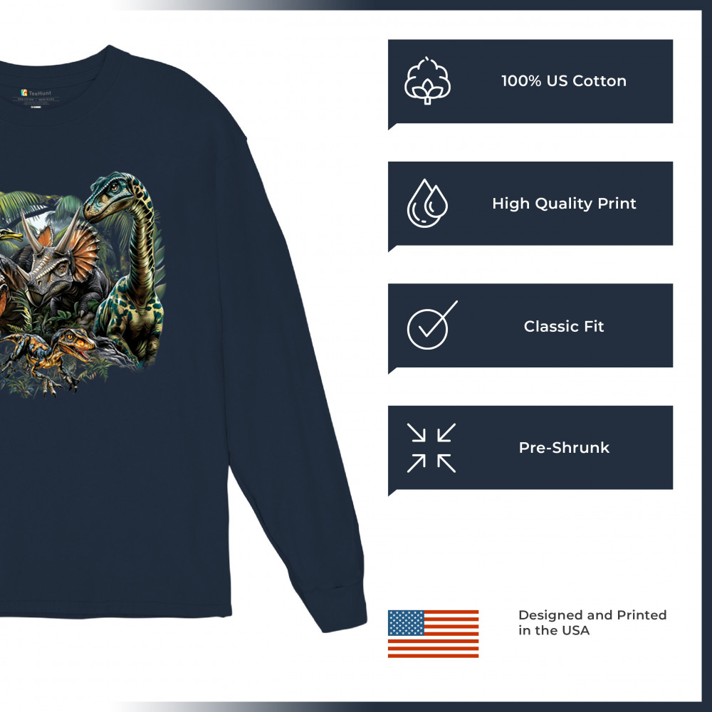 Bold jungle dinosaur design featuring t rex, triceratops, raptor, brachiosaurus, and pteranodon. Perfect for parties, digs, and dino fans.