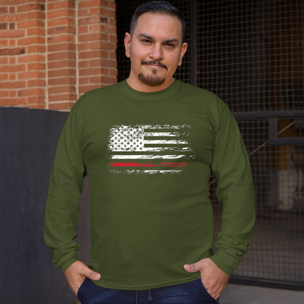 DISTRESSED AMERICAN FLAG long sleeve t-shirt thind red line firefighter military green