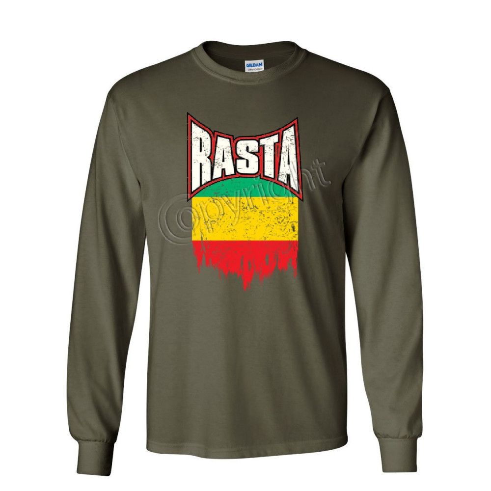 DISTRESSED RASTA FLAG long sleeve t-shirt smoking 420 reggae marijuana weed tee military green