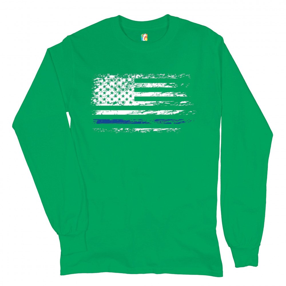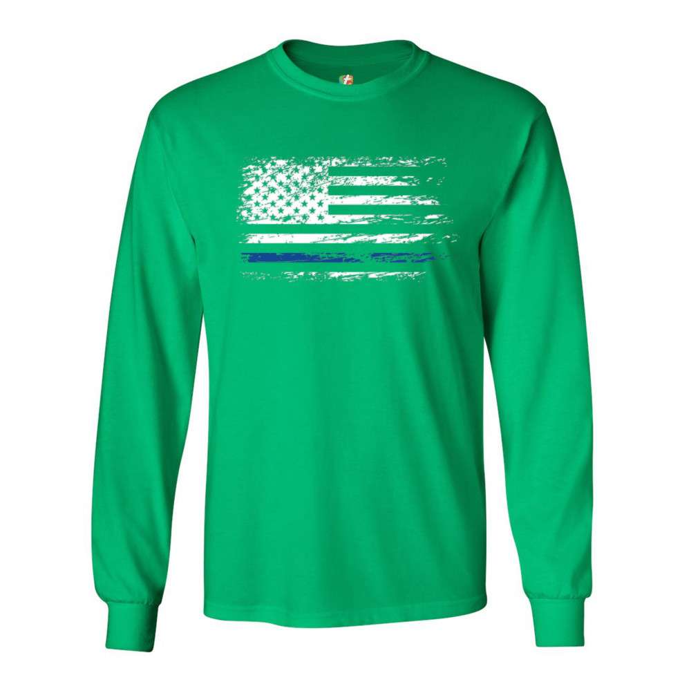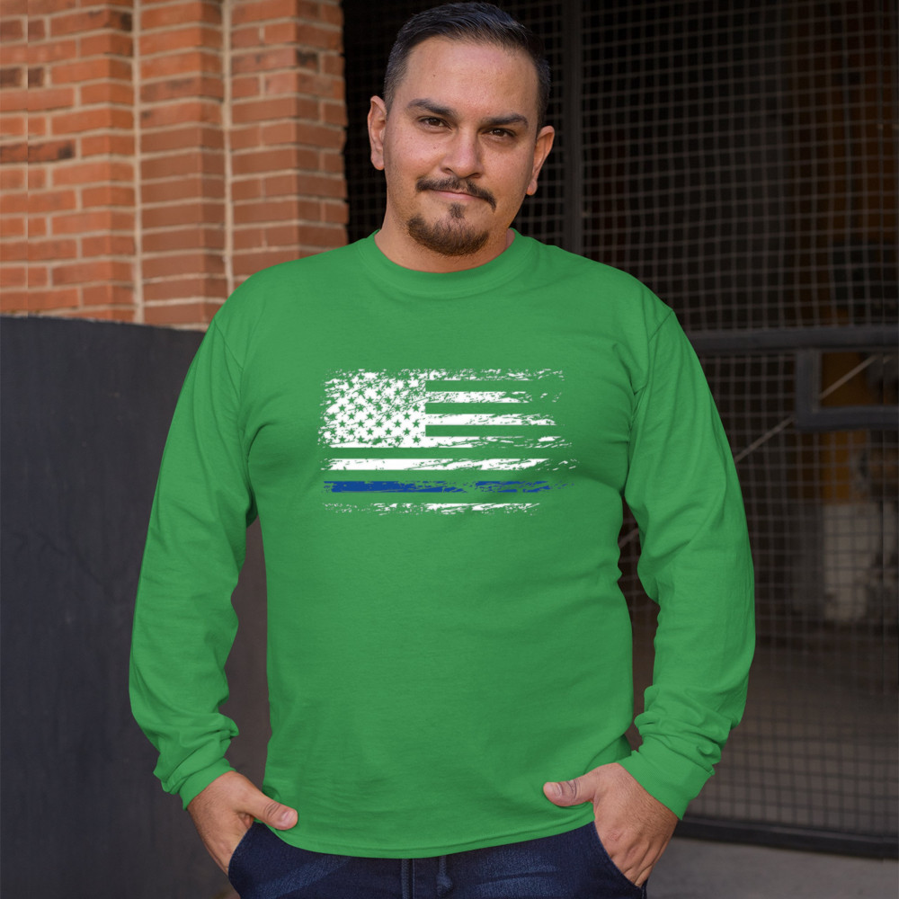 DISTRESSED THIN BLUE LINE AMERICAN FLAG long sleeve t-shirt patriotic police green