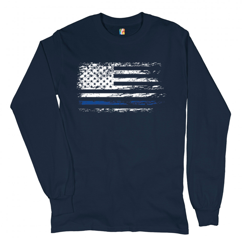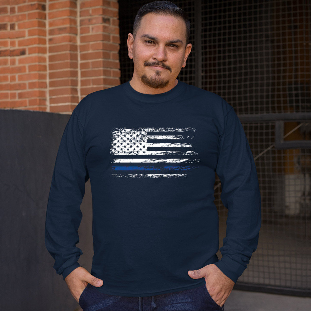 DISTRESSED THIN BLUE LINE AMERICAN FLAG long sleeve t-shirt patriotic police navy blue