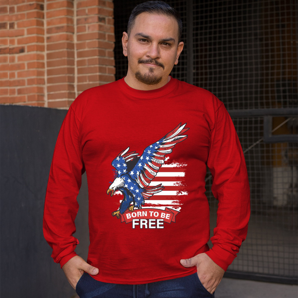 A patriotic print saying "Born to Be Free" and featuring a diving American Bald Eagle. In the background there is a distressed American Flag and the eagle is covered with Stars and Stripes. Great choice to wear on Independence Day or any other patriotic h