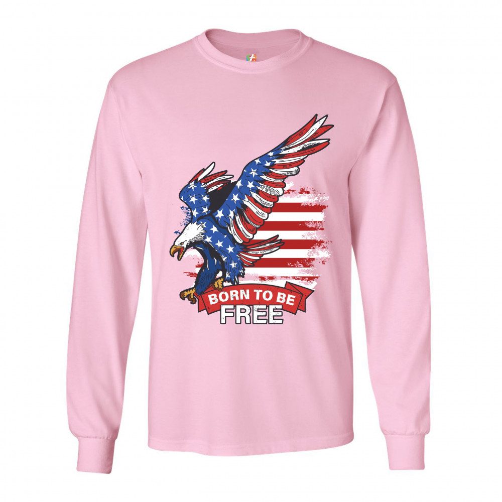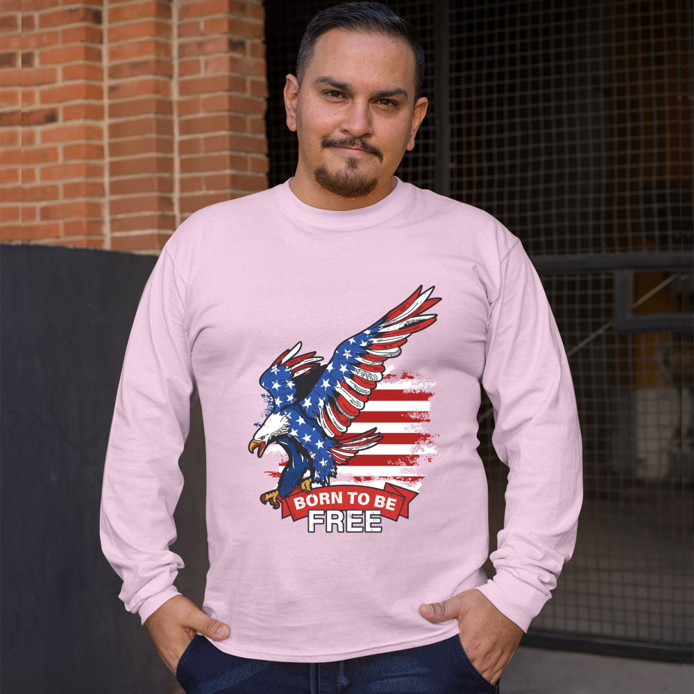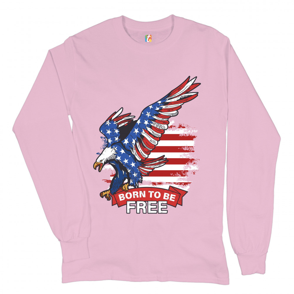 A patriotic print saying "Born to Be Free" and featuring a diving American Bald Eagle. In the background there is a distressed American Flag and the eagle is covered with Stars and Stripes. Great choice to wear on Independence Day or any other patriotic h