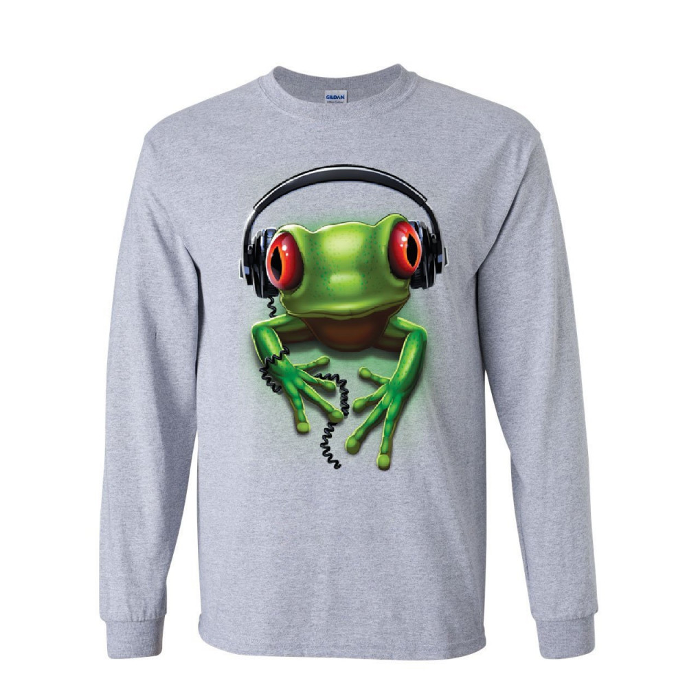 DJ FROG WITH HEADPHONES long sleeve t-shirt cute animal music wildlife rock tee gray