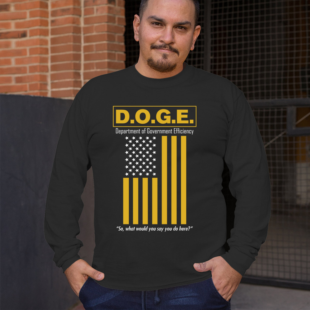 The D.O.G.E. Department of Government Efficiency design features bold yellow lettering and a sarcastic punchline aimed at bloated systems. Clean typography paired with a reimagined American flag gives this political parody retro appeal. Ideal for libertarians, patriots, or anyone fed up with inefficiency and red tape.