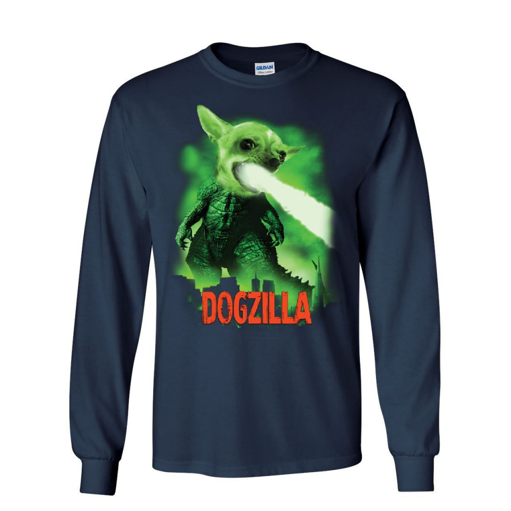 DOGZILLA FUNNY long sleeve t-shirt movie parody dog pet lovers atomic breath tee navy blue