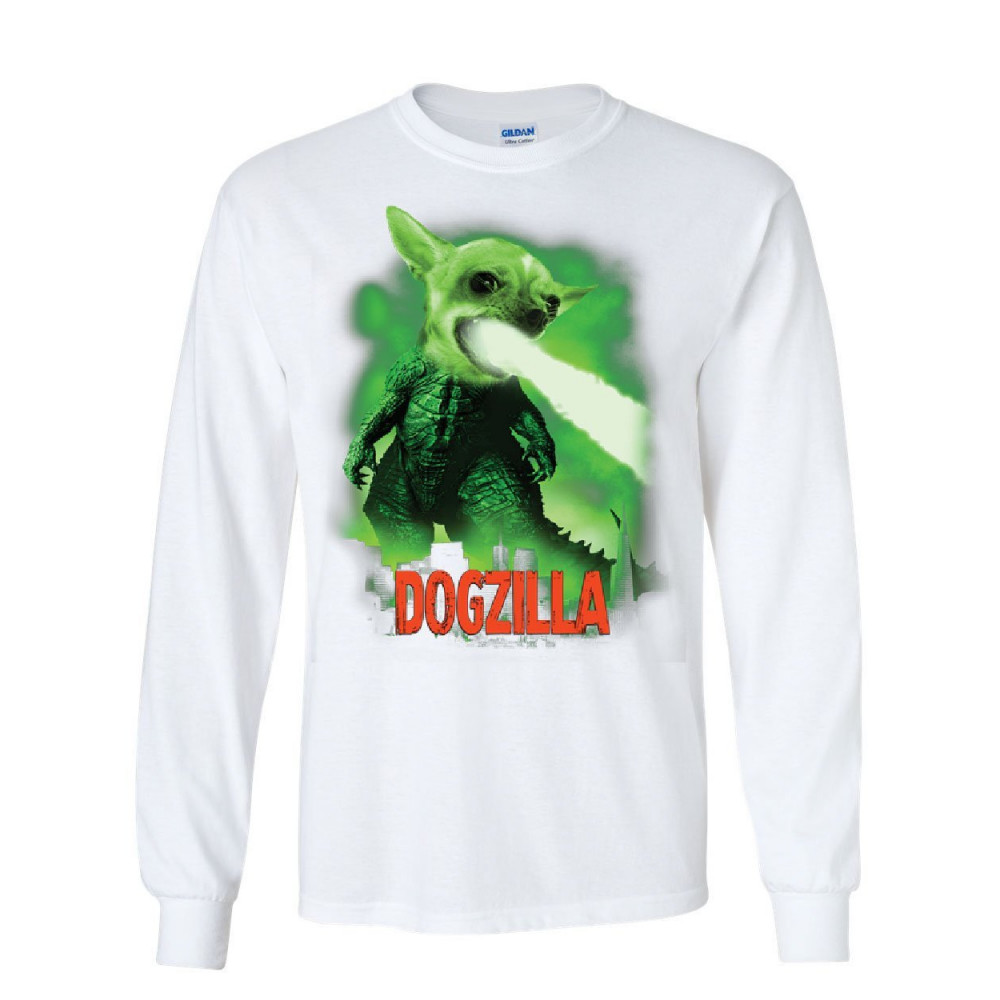 DOGZILLA FUNNY long sleeve t-shirt movie parody dog pet lovers atomic breath tee white