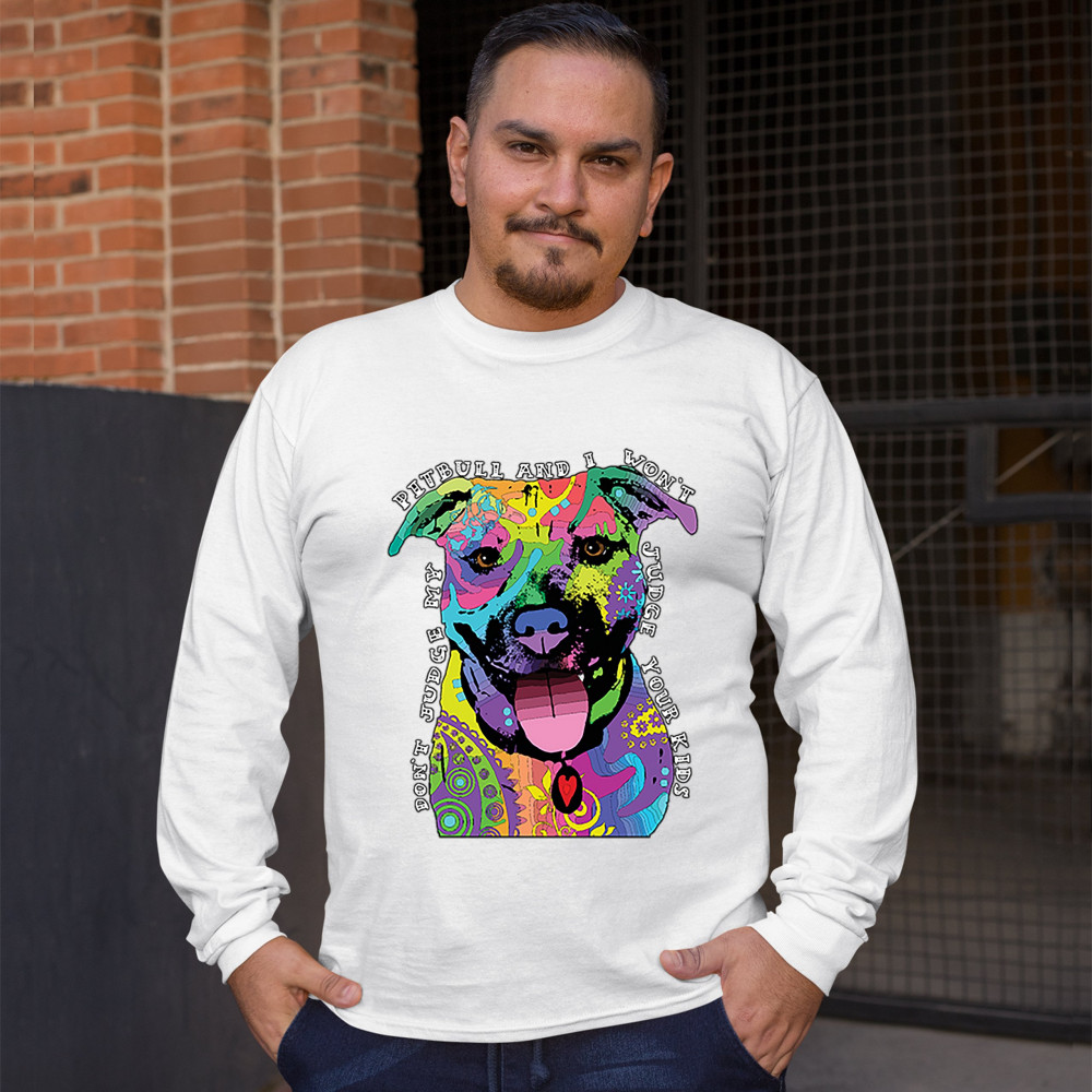 DON'T JUDGE MY PIT BULL long sleeve t-shirt funny andy maxx dog lover pet owner white