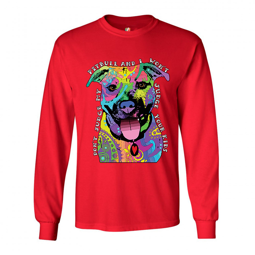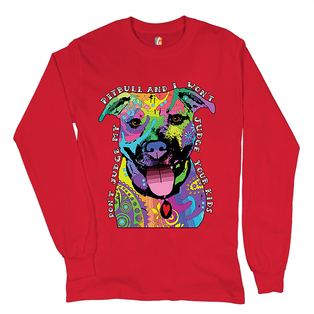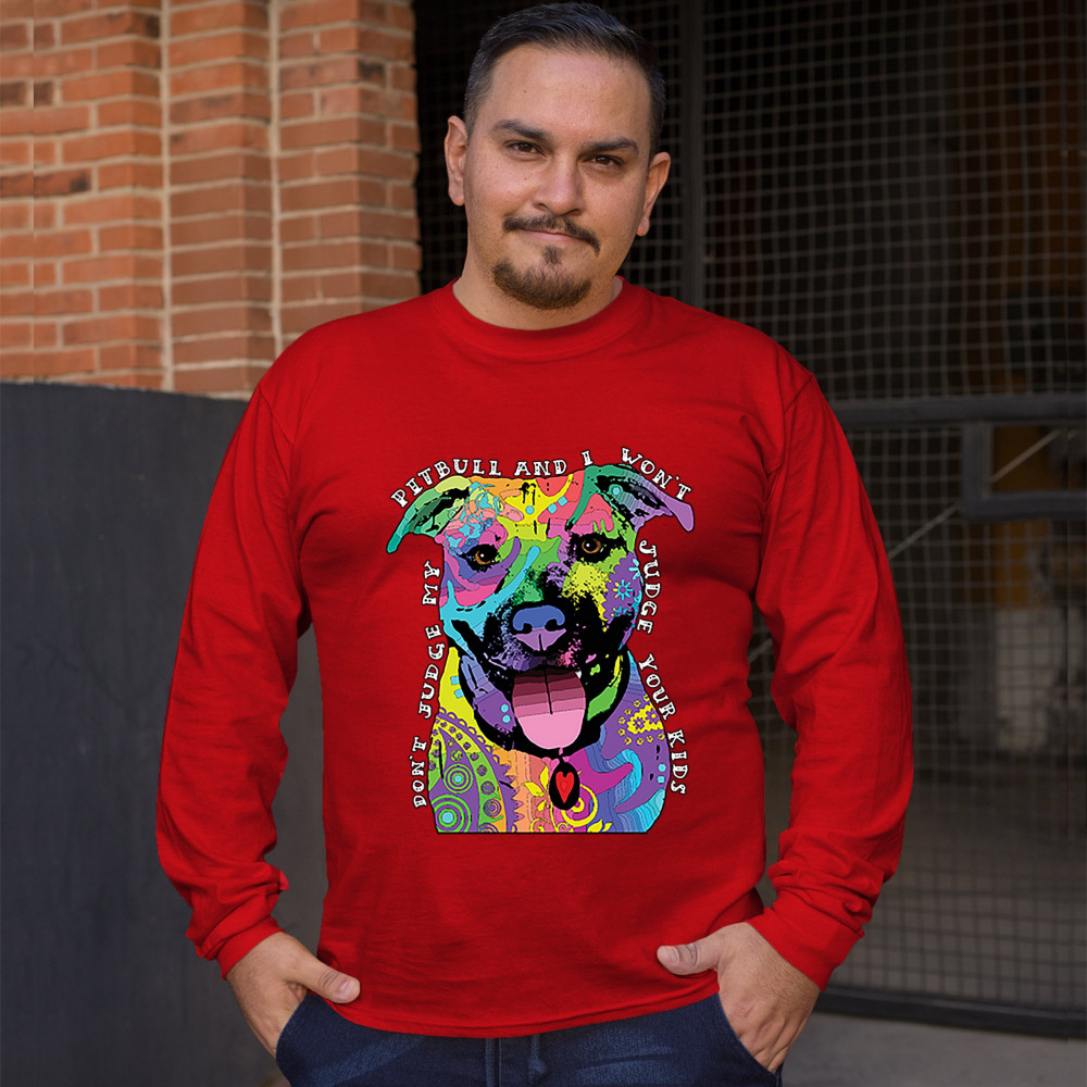 DON'T JUDGE MY PIT BULL long sleeve t-shirt funny andy maxx dog lover pet owner red