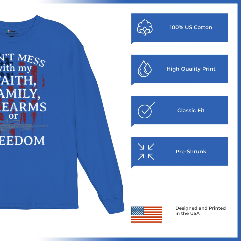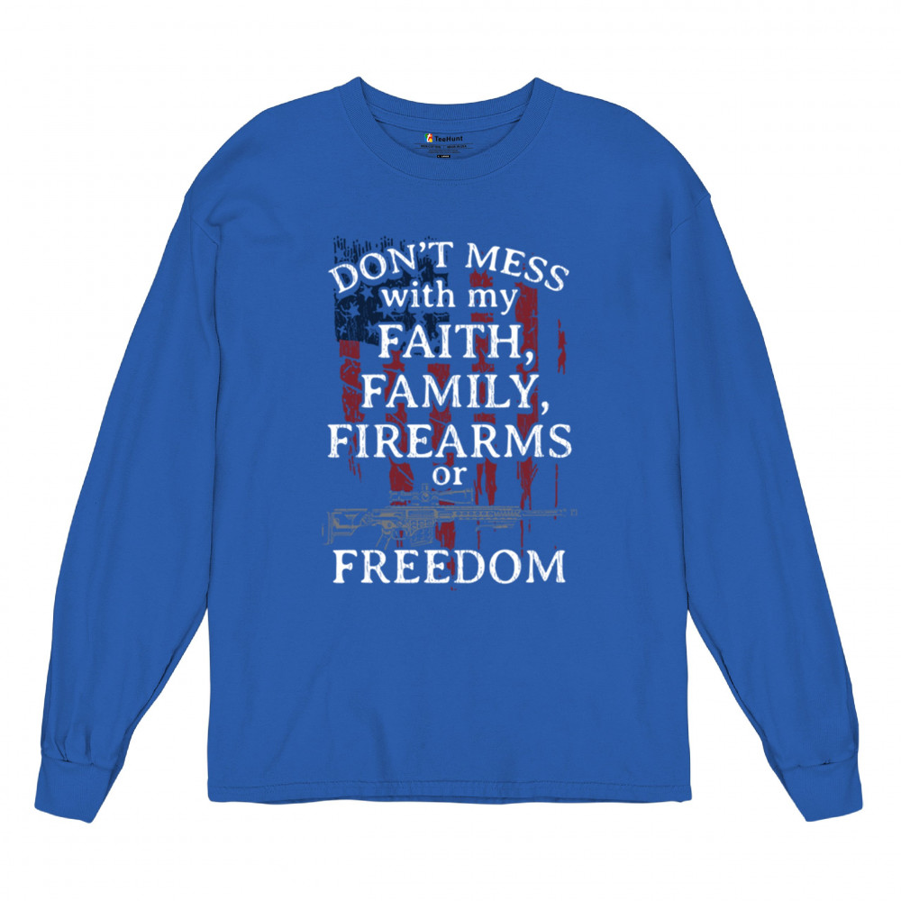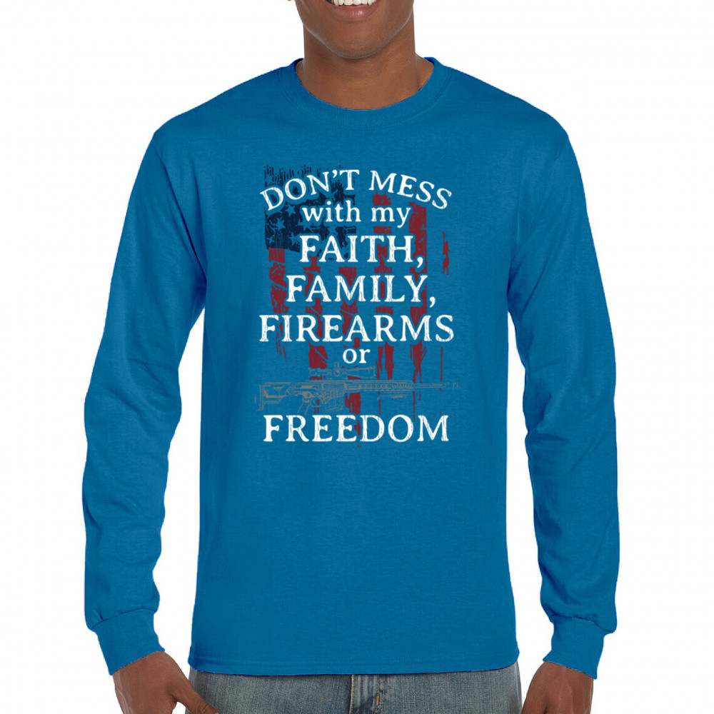 Patriotic shirt with "Don't Mess with My Faith, Family, Firearms, or Freedom" over distressed American flag. Perfect for patriots and veterans.