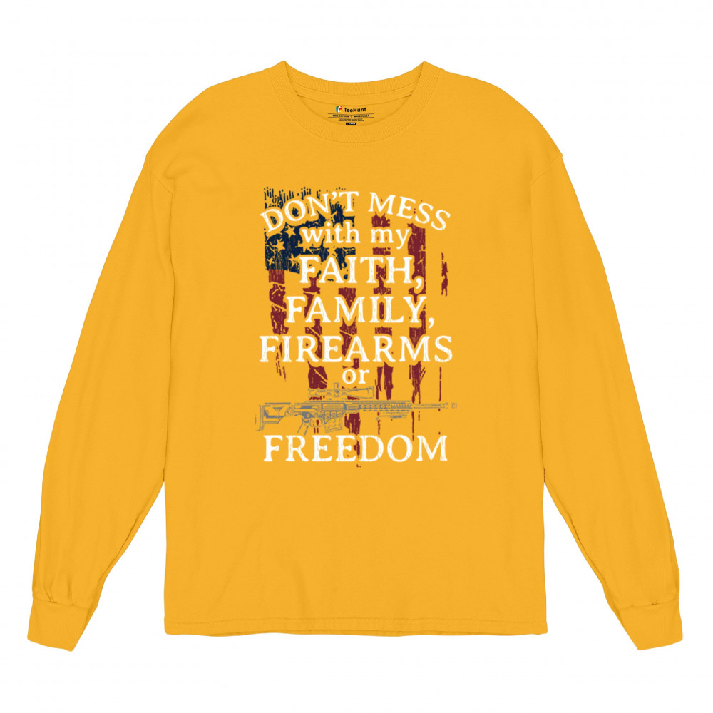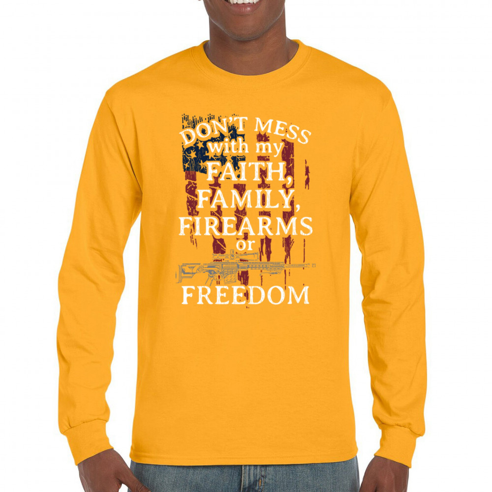 Patriotic shirt with "Don't Mess with My Faith, Family, Firearms, or Freedom" over distressed American flag. Perfect for patriots and veterans.