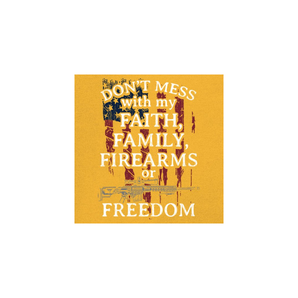 Celebrate your patriotism and core values with this powerful shirt featuring "Don't Mess with My Faith, Family, Firearms, or Freedom" set against a distressed American flag. This shirt is perfect for patriots, veterans, and those who hold their religious beliefs and the right to bear arms in high regard. Made from high-quality fabric, it ensures comfort and durability for everyday wear. Wear it proudly at patriotic events, on the 4th of July, or anytime you want to make a strong statement about your beliefs. It’s an excellent gift for anyone who shares these values and supports the American flag and the stars and stripes.