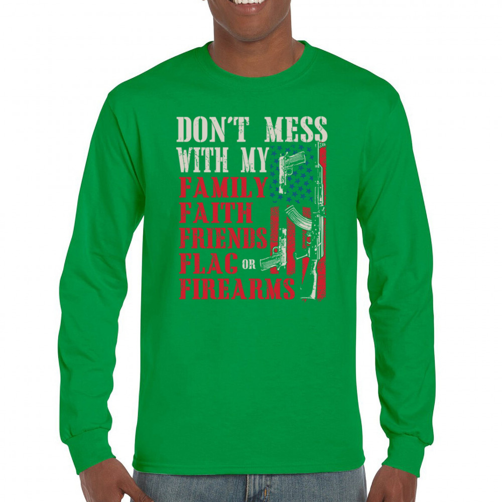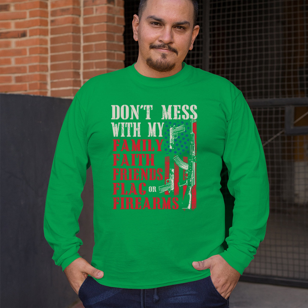 Patriotic design for gun owners and liberty-lovers. Bold message defends family, flag, and firearms with unapologetic American pride.