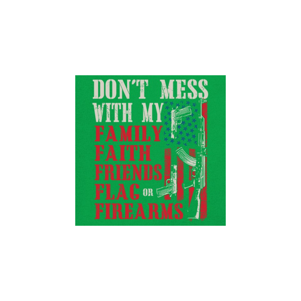Don’t mess with a patriot’s core. This powerful design shouts loyalty to family, faith, friends, flag, and firearms. Featuring bold lettering on an American flag backdrop, it’s made for defenders of freedom, gun rights, and American values. Ideal for veterans, 2A supporters, and anyone who won’t back down from defending what they love.