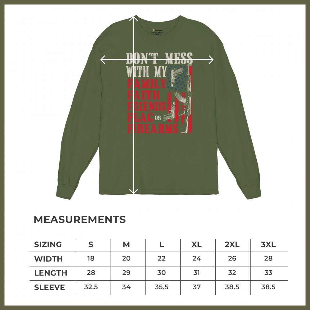 Don’t mess with a patriot’s core. This powerful design shouts loyalty to family, faith, friends, flag, and firearms. Featuring bold lettering on an American flag backdrop, it’s made for defenders of freedom, gun rights, and American values. Ideal for veterans, 2A supporters, and anyone who won’t back down from defending what they love.