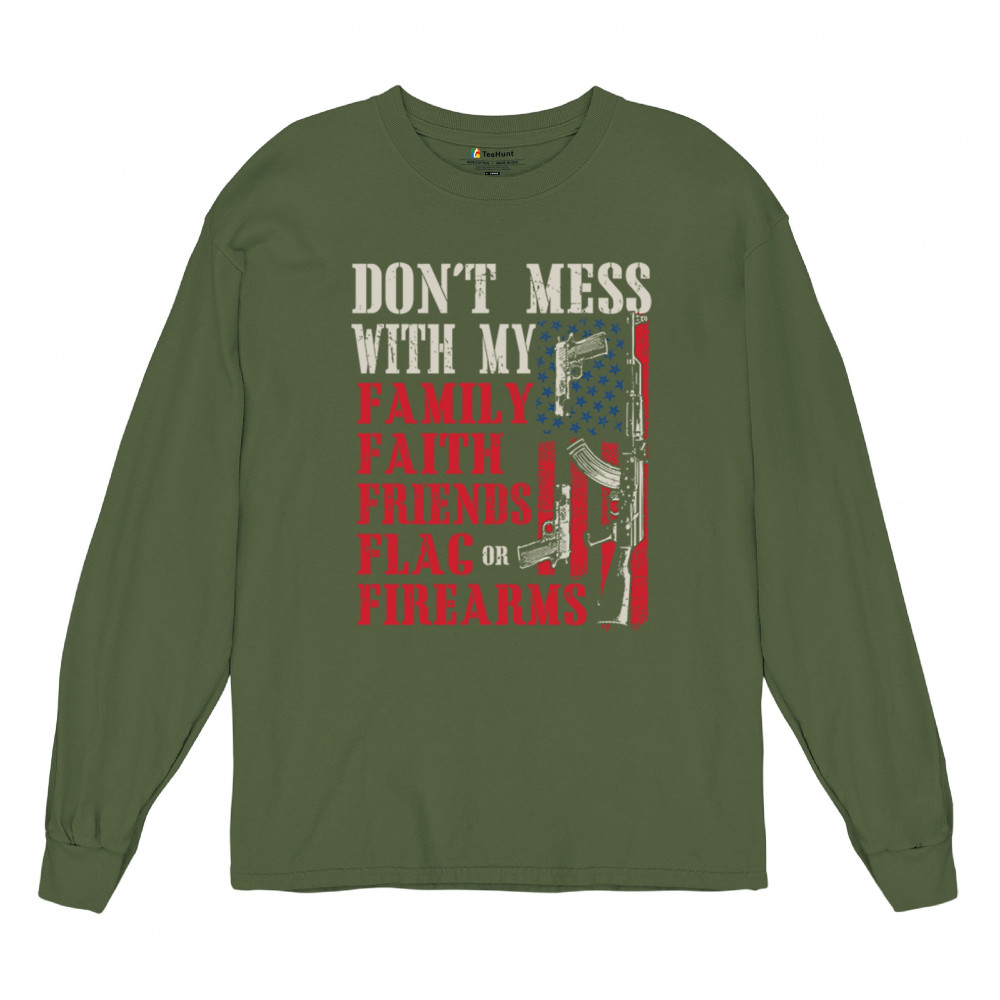 Patriotic design for gun owners and liberty-lovers. Bold message defends family, flag, and firearms with unapologetic American pride.
