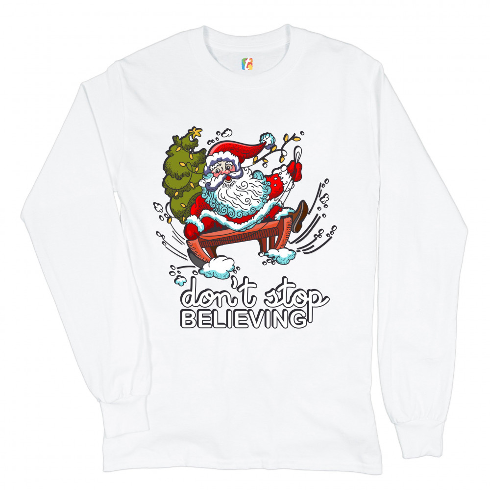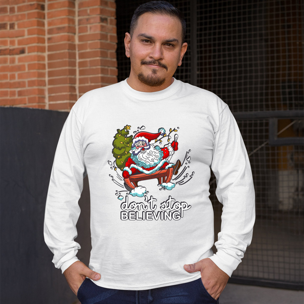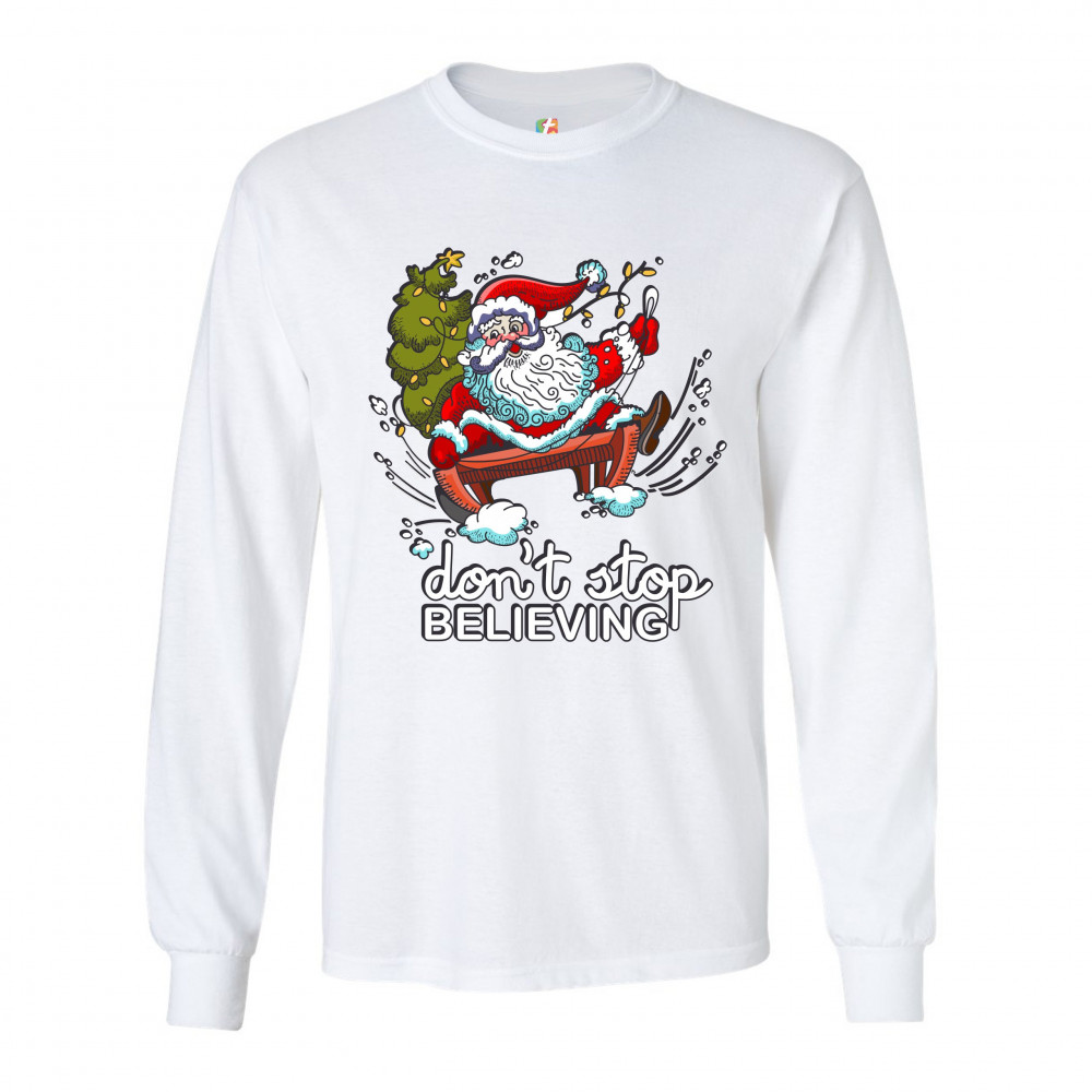 DON'T STOP BELIEVING long sleeve t-shirt christmas holiday spirit santa claus white