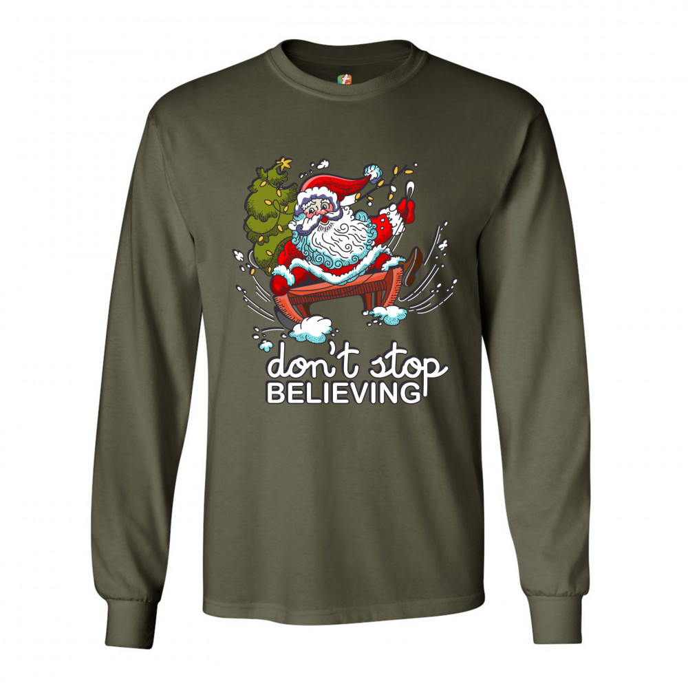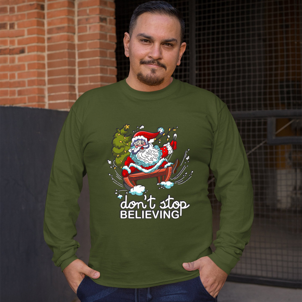 DON'T STOP BELIEVING long sleeve t-shirt christmas holiday spirit santa claus military green