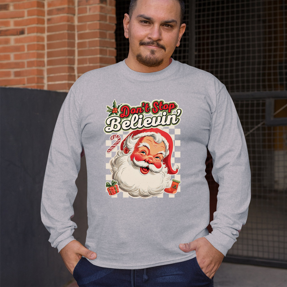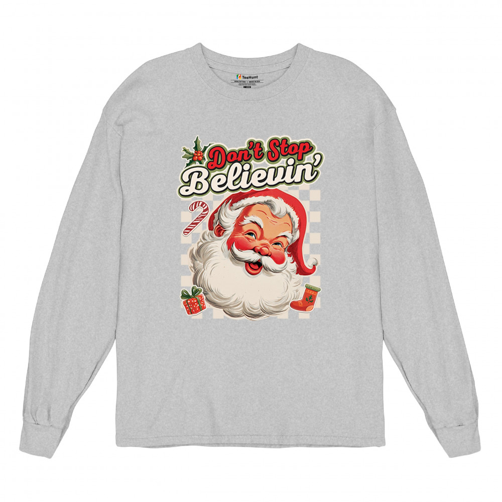 Spread holiday cheer with this “Don’t Stop Believing†Santa Claus shirt that blends classic Christmas spirit with cozy winter charm. Perfect for festive parties, family gatherings, or relaxing by the fire, this design captures Jingle Bells joy, Merry Xmas fun, Santa Claus magic, Reindeer delight, Rudolph glow, Snowman charm, and Christmas tree style for the perfect seasonal outfit.