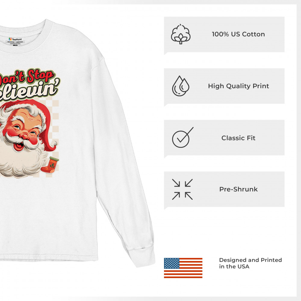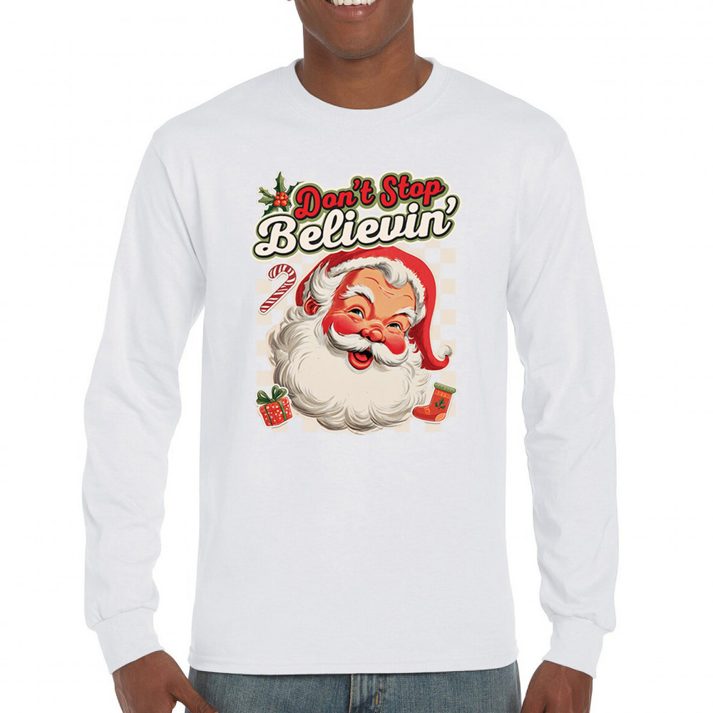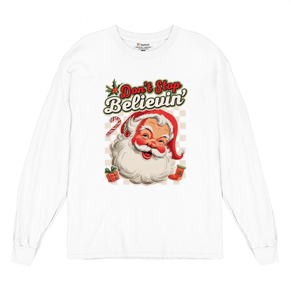Spread holiday cheer with this “Don’t Stop Believing†Santa Claus shirt that blends classic Christmas spirit with cozy winter charm. Perfect for festive parties, family gatherings, or relaxing by the fire, this design captures Jingle Bells joy, Merry Xmas fun, Santa Claus magic, Reindeer delight, Rudolph glow, Snowman charm, and Christmas tree style for the perfect seasonal outfit.