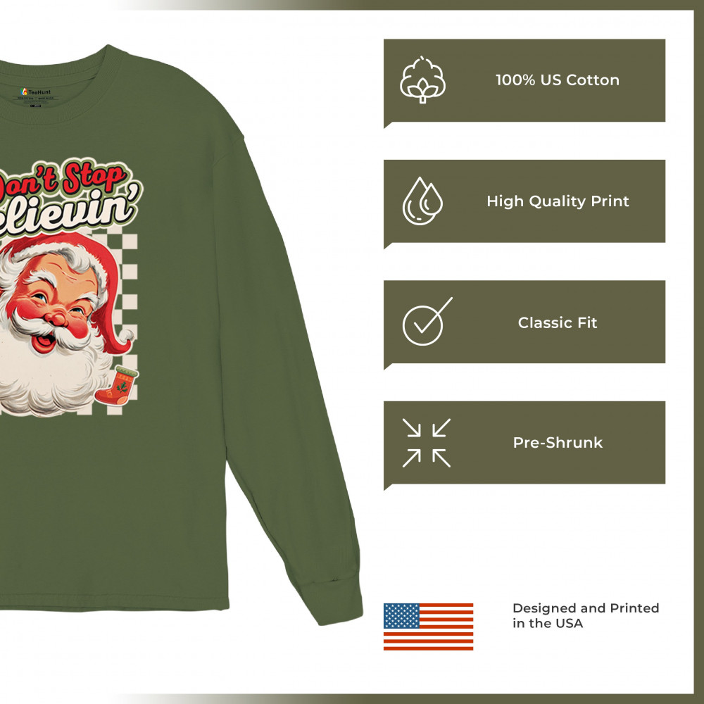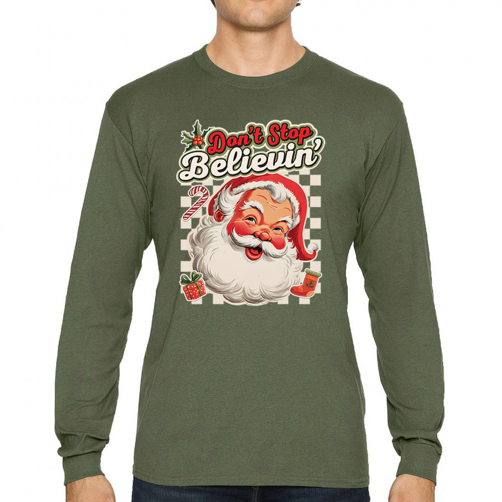 Spread holiday cheer with this “Don’t Stop Believing†Santa Claus shirt that blends classic Christmas spirit with cozy winter charm. Perfect for festive parties, family gatherings, or relaxing by the fire, this design captures Jingle Bells joy, Merry Xmas fun, Santa Claus magic, Reindeer delight, Rudolph glow, Snowman charm, and Christmas tree style for the perfect seasonal outfit.