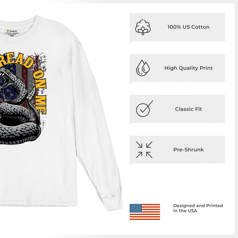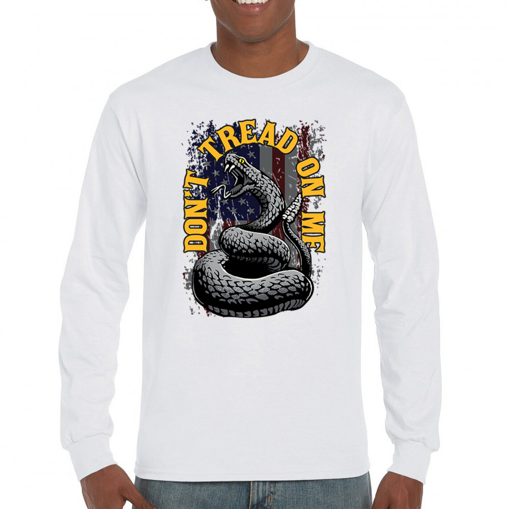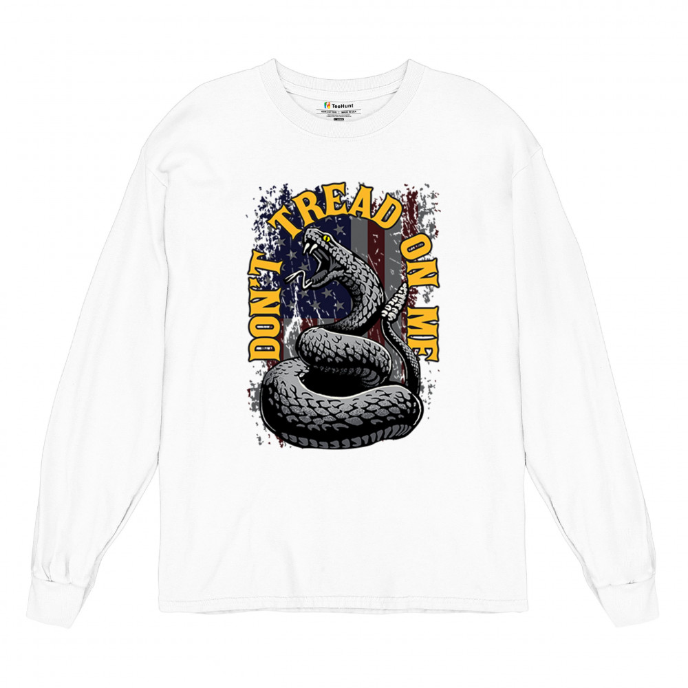 Bold "Don't Tread on Me" design with snake and American flag. Ideal for patriots. Show your love for freedom and independence.