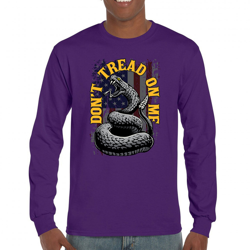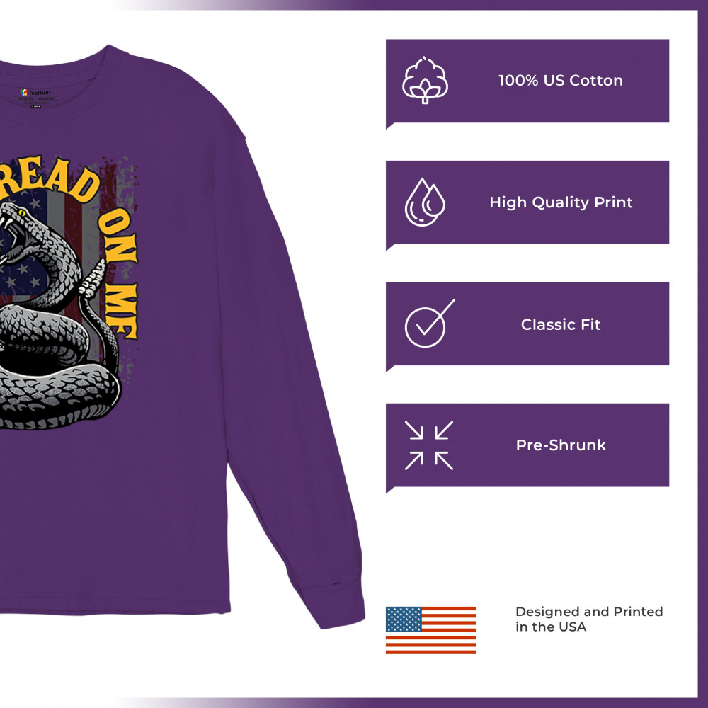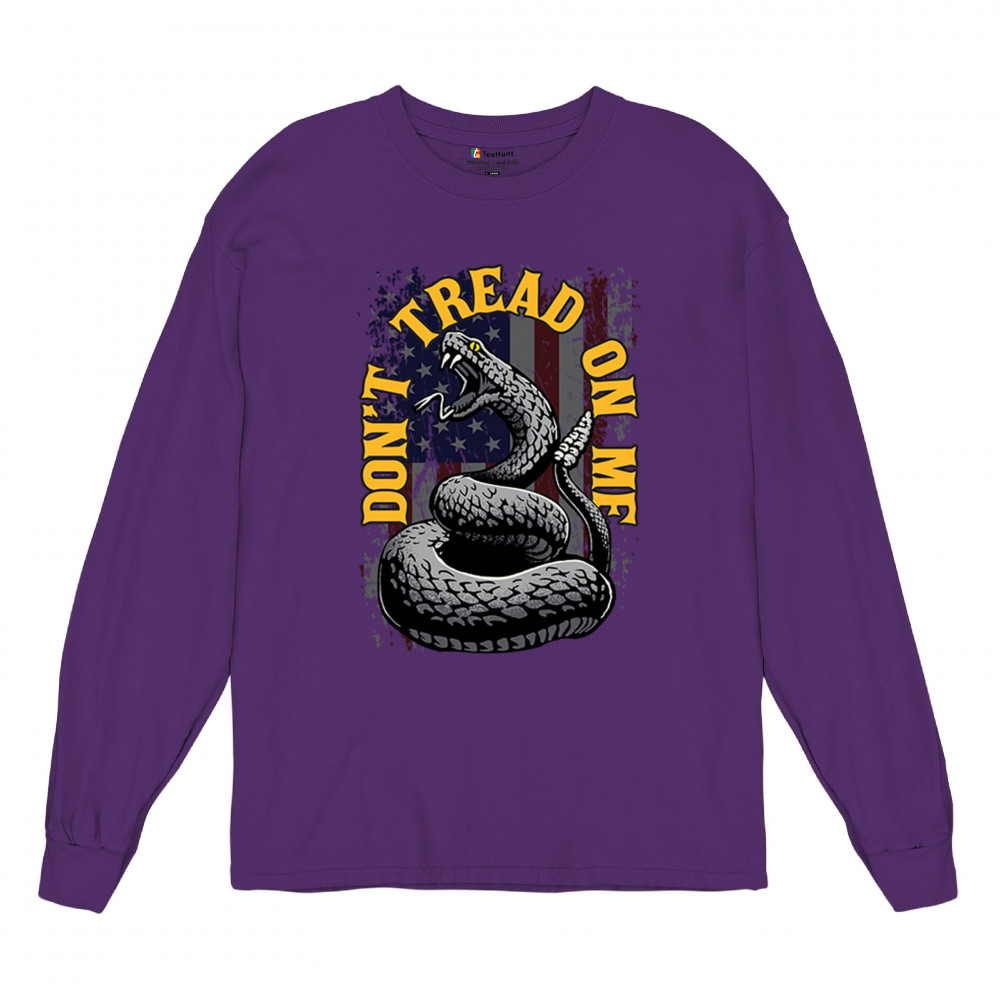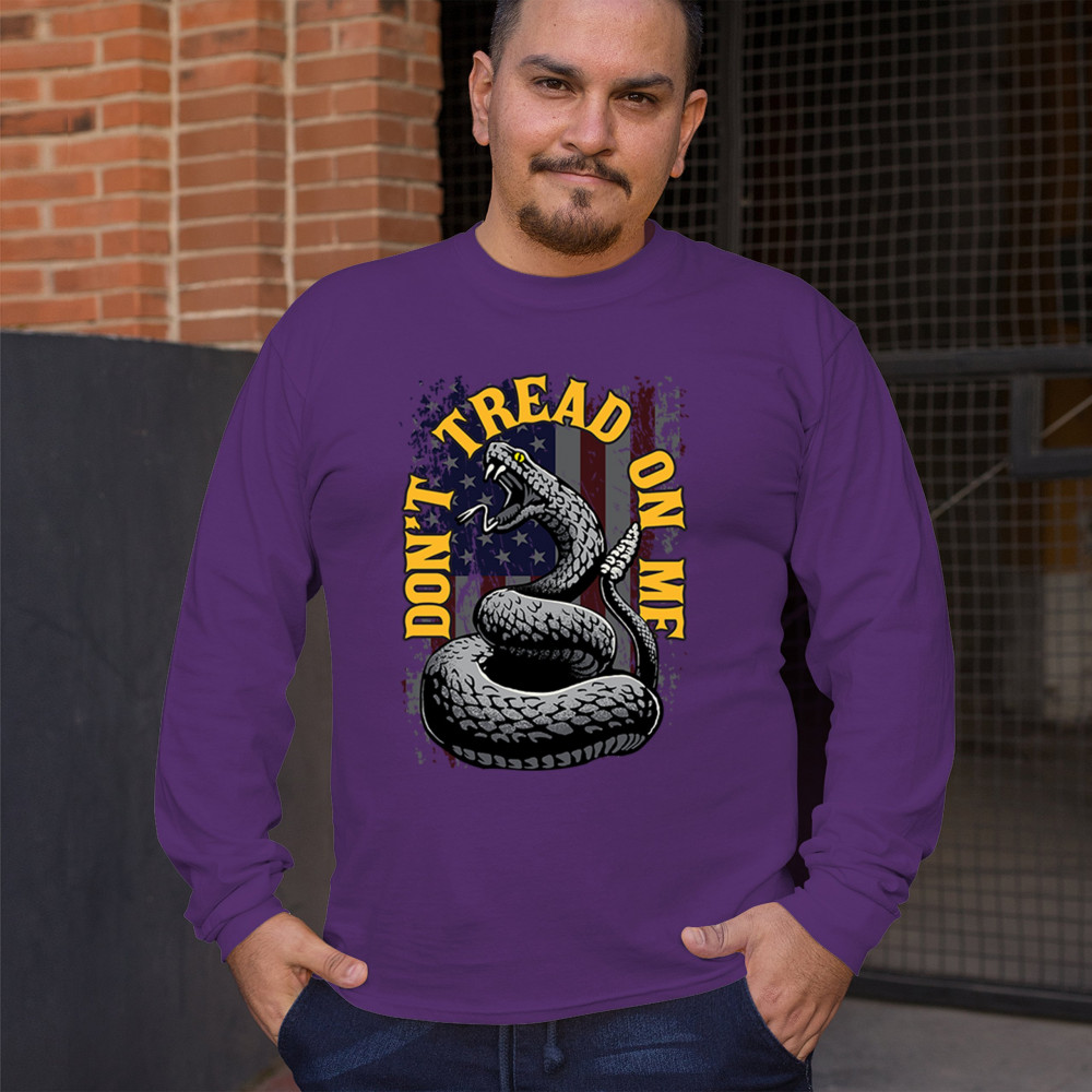Bold "Don't Tread on Me" design with snake and American flag. Ideal for patriots. Show your love for freedom and independence.