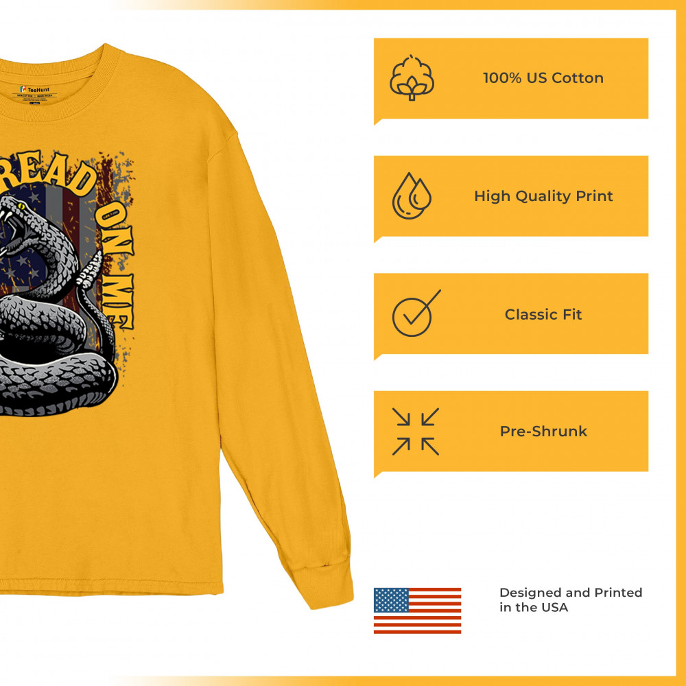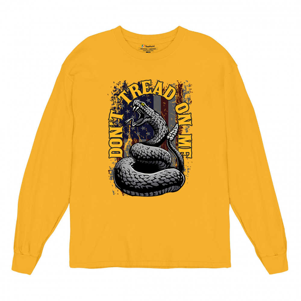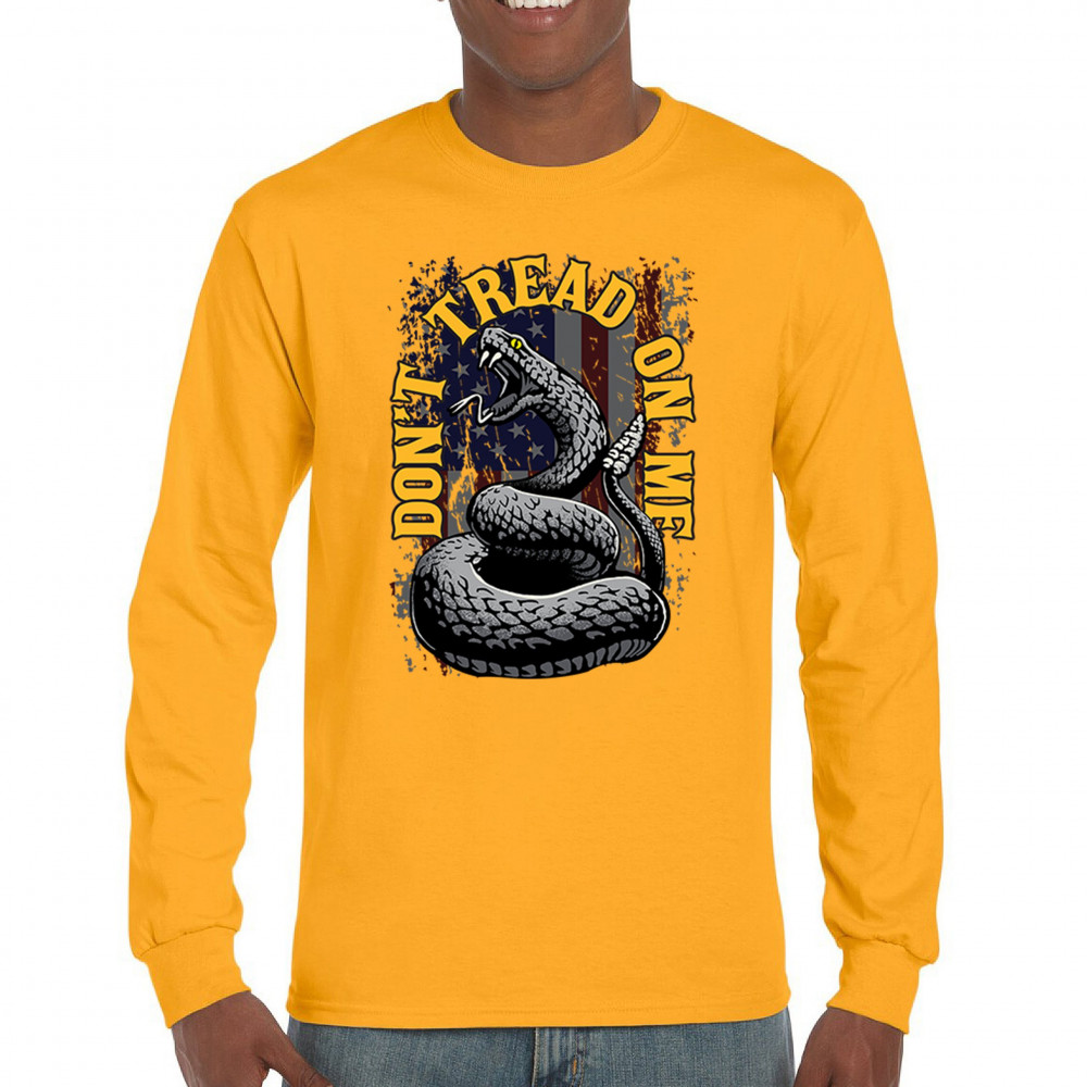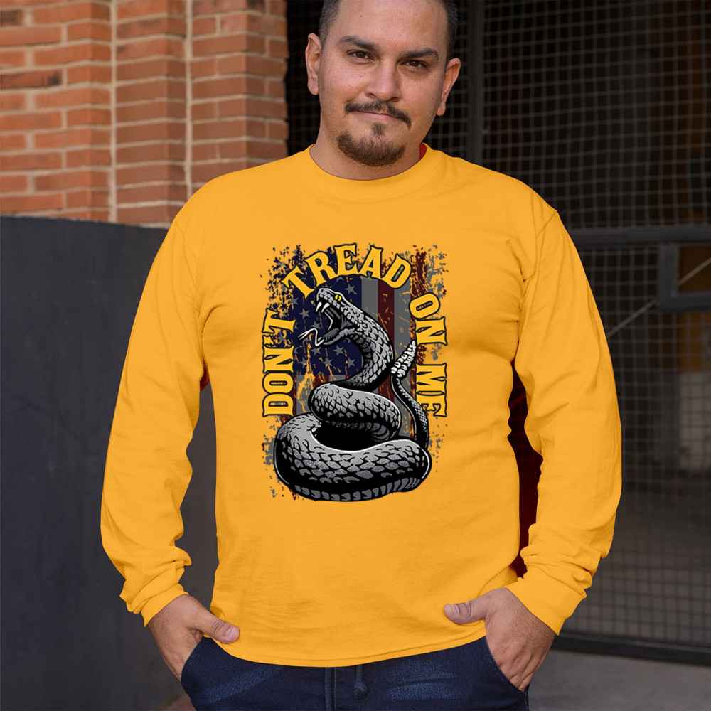Bold "Don't Tread on Me" design with snake and American flag. Ideal for patriots. Show your love for freedom and independence.