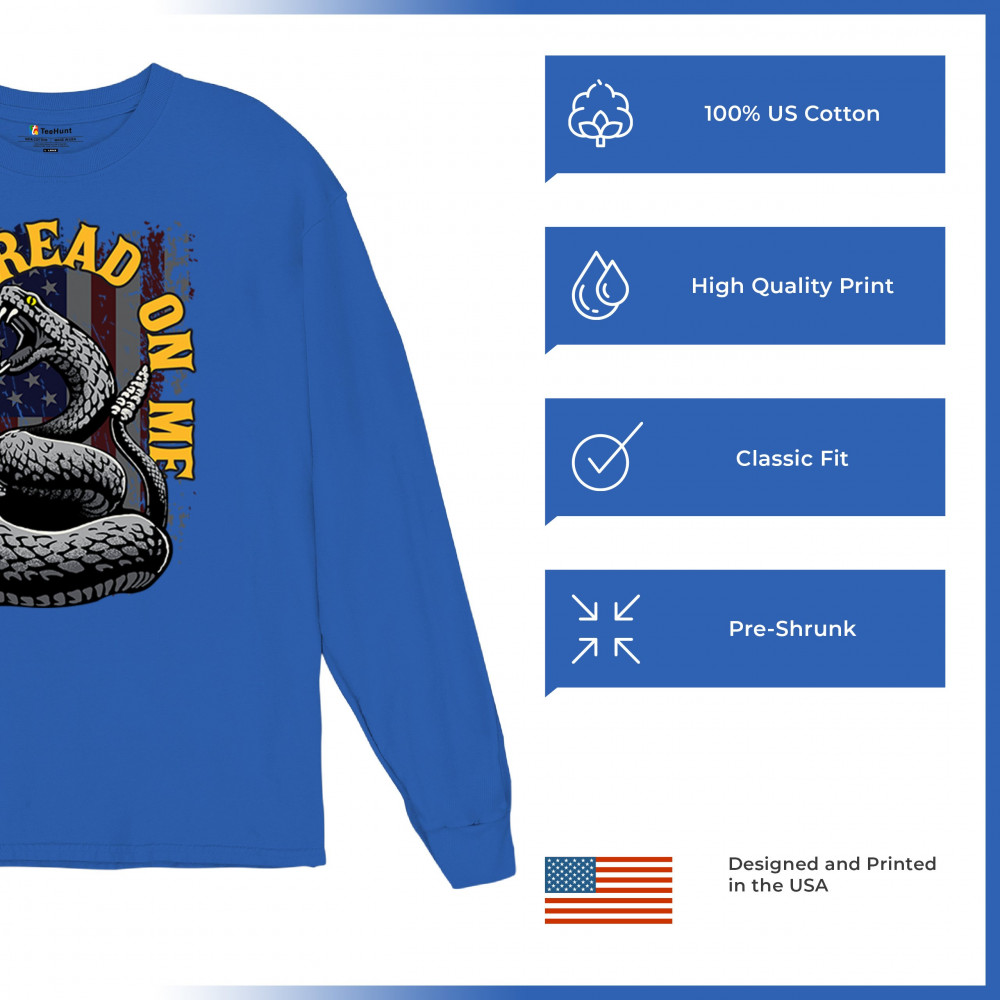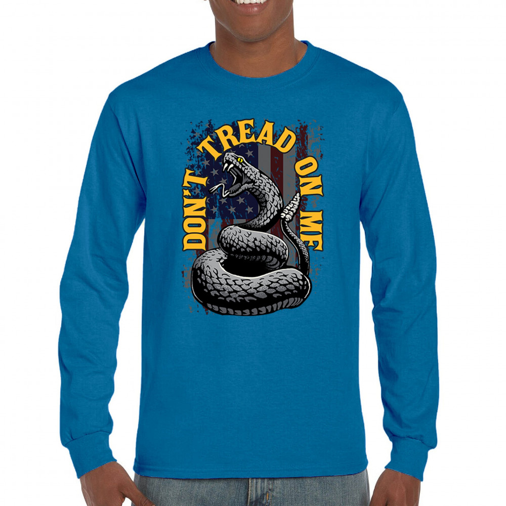 Bold "Don't Tread on Me" design with snake and American flag. Ideal for patriots. Show your love for freedom and independence.