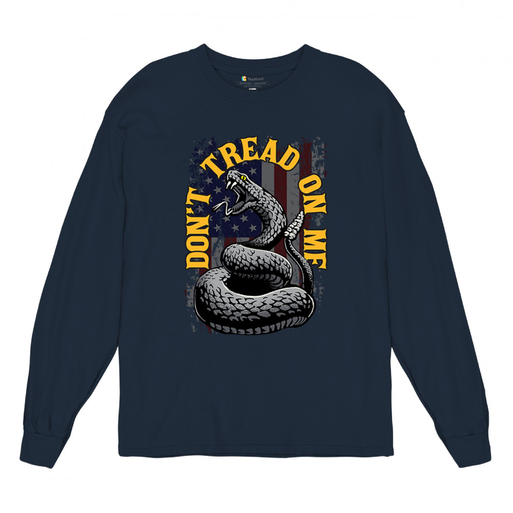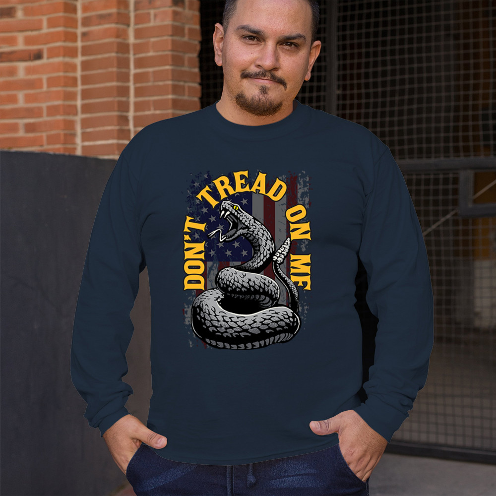 Bold "Don't Tread on Me" design with snake and American flag. Ideal for patriots. Show your love for freedom and independence.