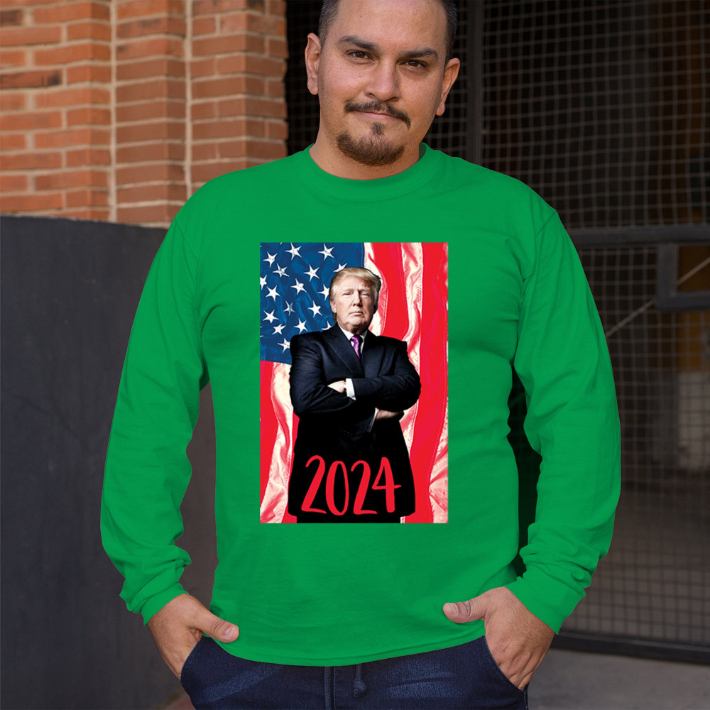 Showcase your unwavering support and patriotic pride with our exclusive design, featuring Donald Trump poised before the American flag with "2024" inscribed below. This powerful imagery is a testament to the conservative journey towards victory, echoing the calls of "America First" and unity under a common cause. It's a tribute to those who believe in standing firm, fueled by trust in God and a commitment to the principles that define us. A must-have for every supporter ready to be part of the next chapter in American history.