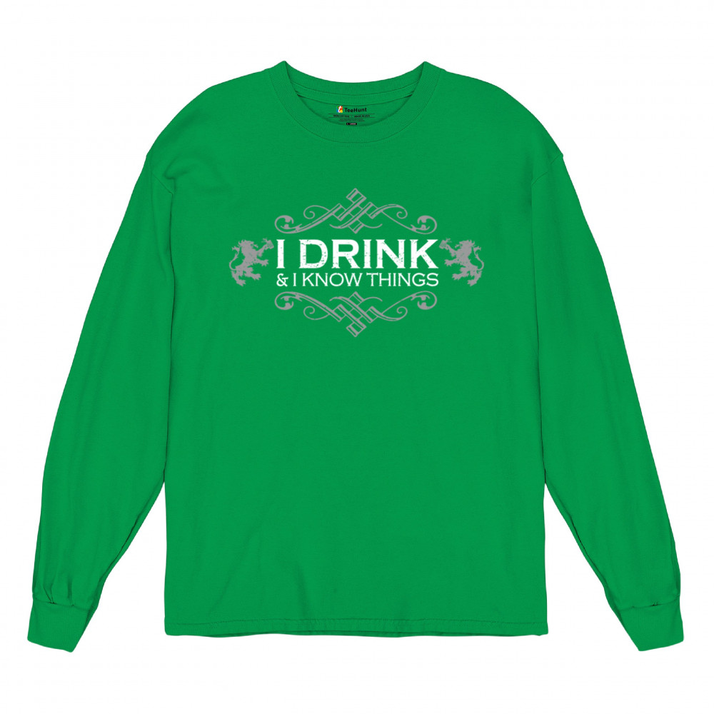 Funny fantasy design with “I Drink and I Know Things†quote, perfect for bar nights, humor lovers, trivia kings, and dry sarcasm fans.