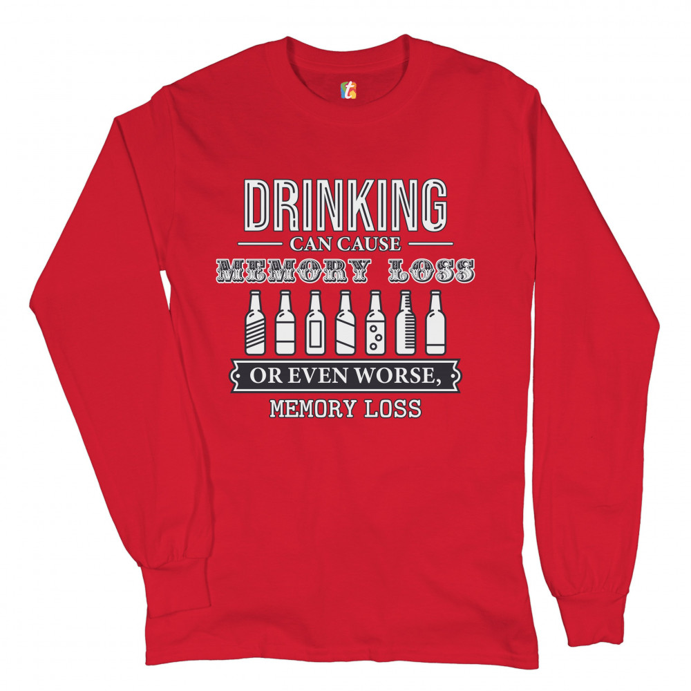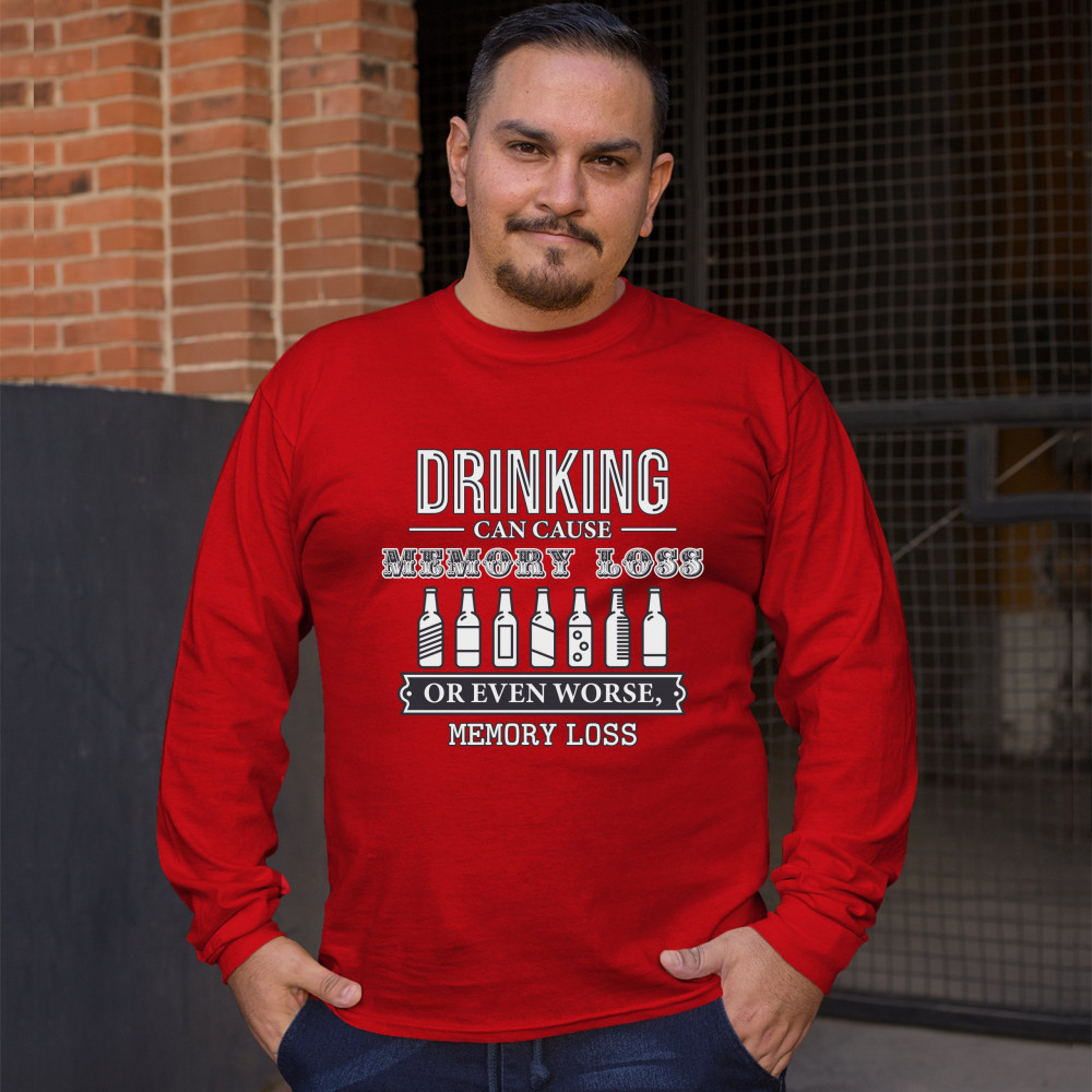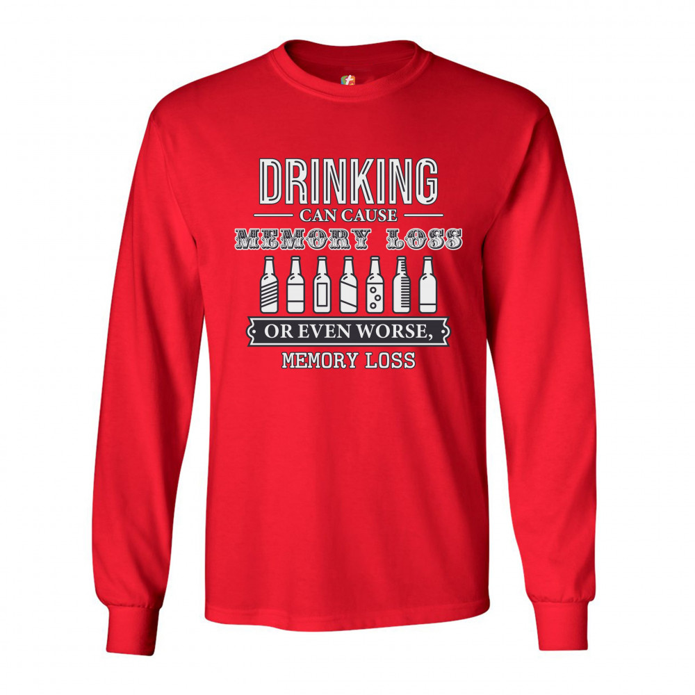 DRINKING CAN CAUSE MEMORY LOSS long sleeve t-shirt alcohol beer inappropriate red