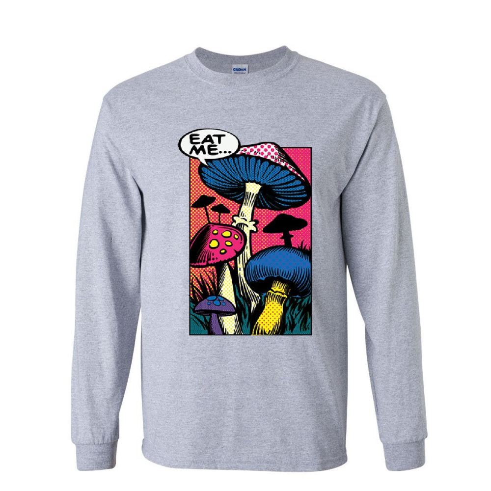 EAT ME... eat me long sleeve t-shirt shroom mushroom fungi psychedelic hallucinations tee gray