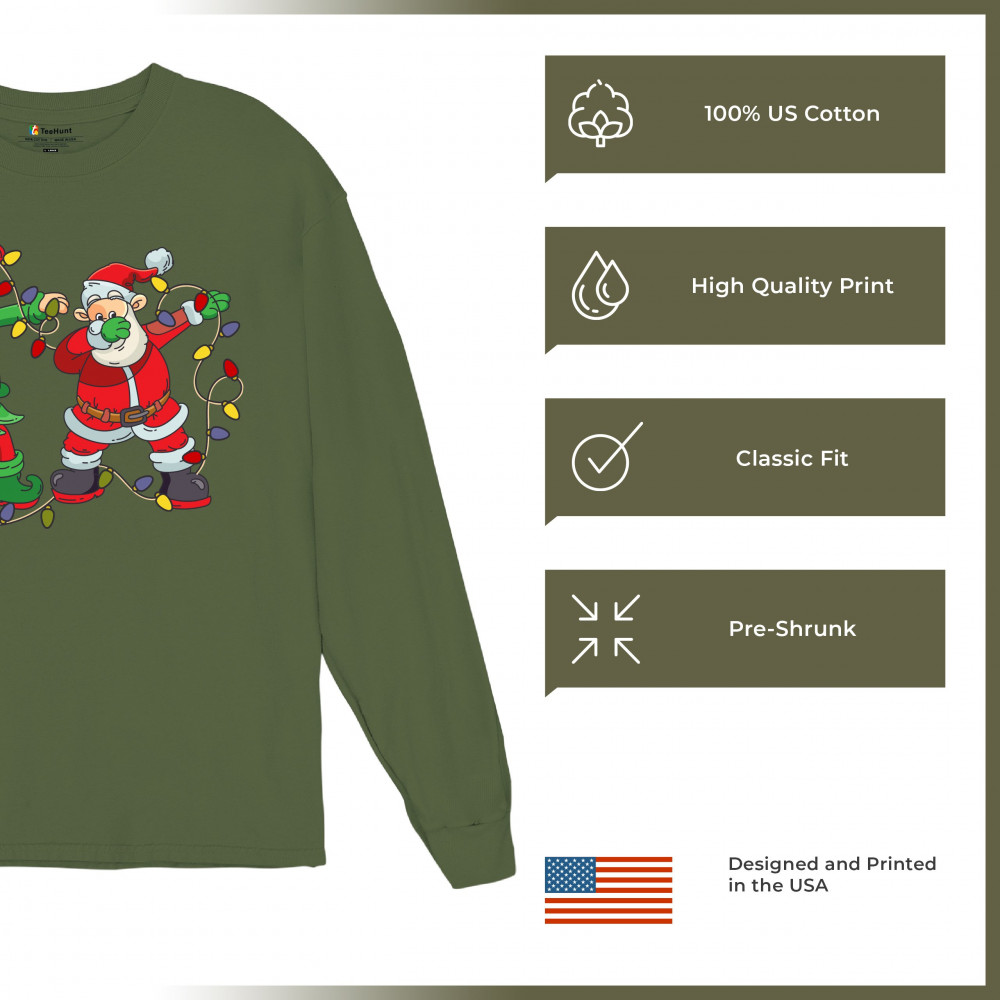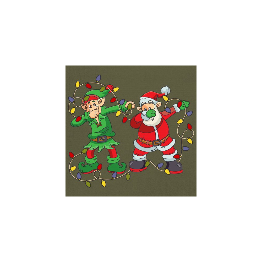 A funny print featuring an elf and Santa Claus dab dancing while surrounded by Christmas lights. Amazing choice to make people smile and spread positive vibes on Christmas Eve.