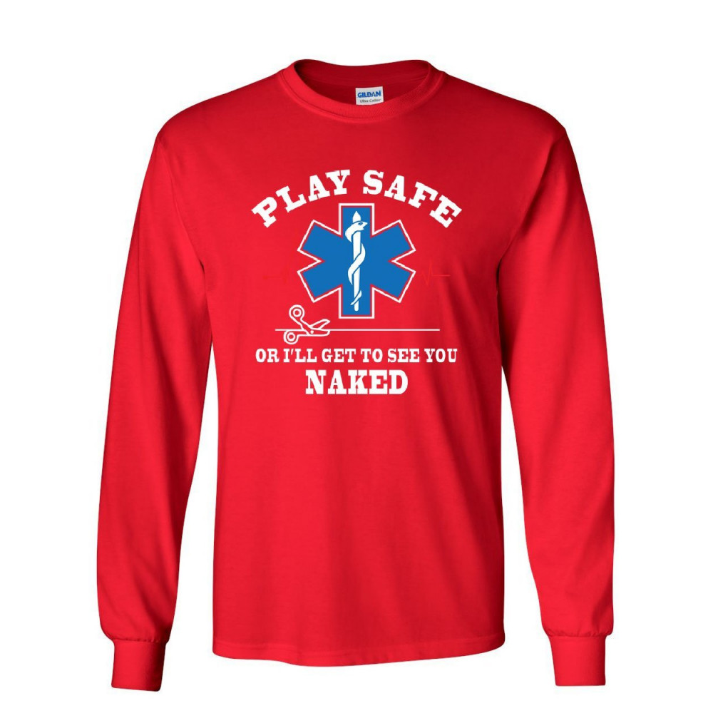 EMS PLAY SAFE OR I'LL GET TO SEE YOU NAKED long sleeve t-shirt paramedic tee red