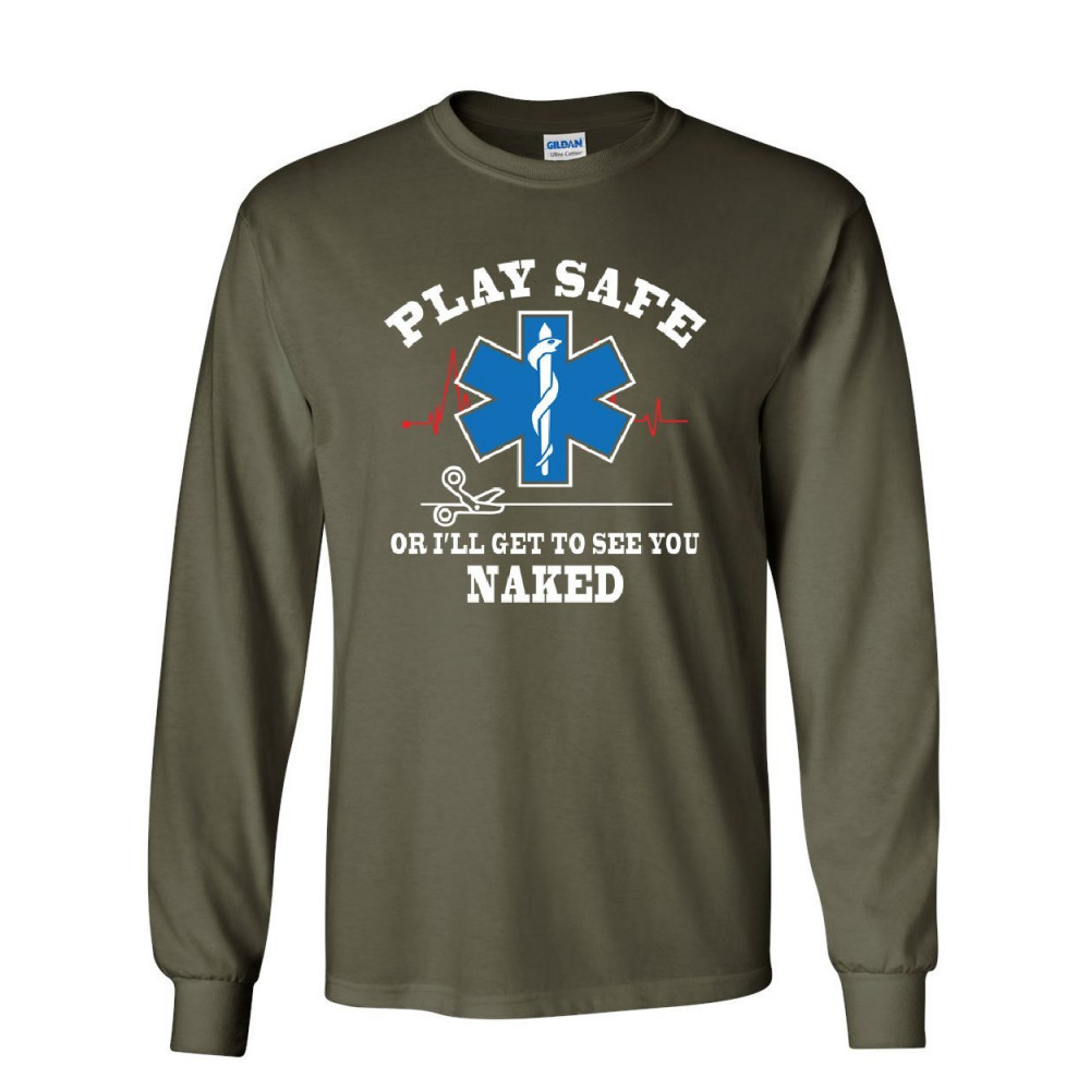 EMS PLAY SAFE OR I'LL GET TO SEE YOU NAKED long sleeve t-shirt paramedic tee military green