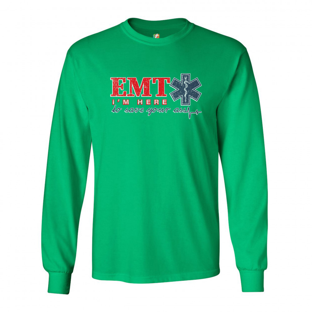 A funny print saying "EMT I'm Here to Save Your Ass". To the right of "EMT" there is the Star of Life, the worldwide recognized symbol of emergency medical services, with the Rod of Asclepius inside of it. A great choice as a gift for a first responder.