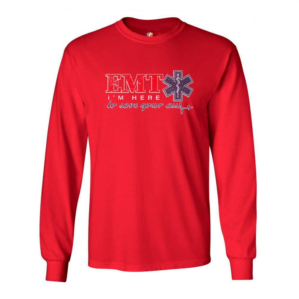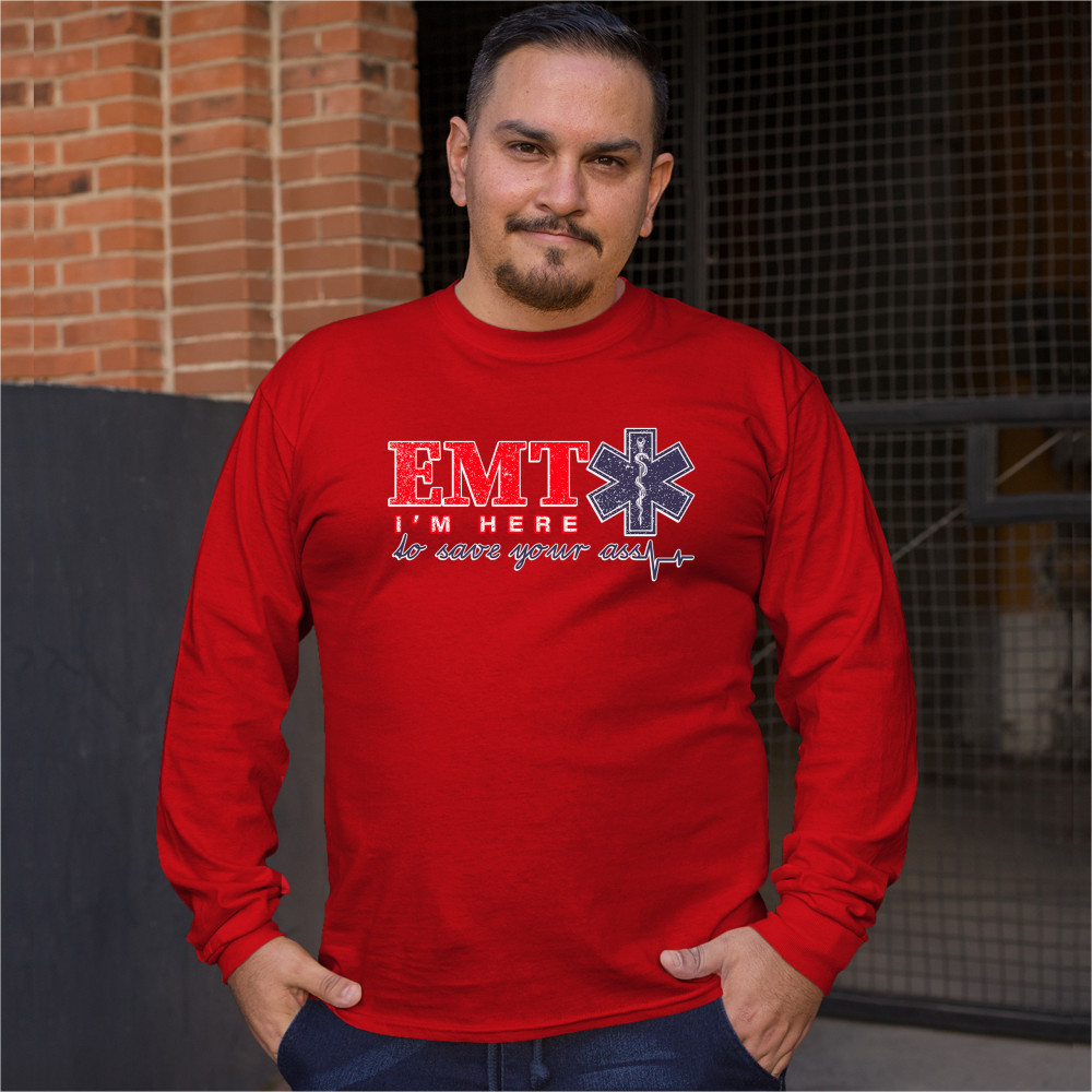 A funny print saying "EMT I'm Here to Save Your Ass". To the right of "EMT" there is the Star of Life, the worldwide recognized symbol of emergency medical services, with the Rod of Asclepius inside of it. A great choice as a gift for a first responder.