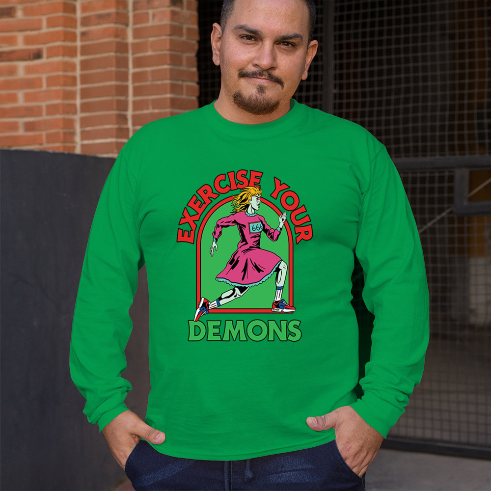 Exercise Your Demons shirt – funny halloween gym shirt with fitness humor, scary workout design, demon runner style, and spooky parody vibes.