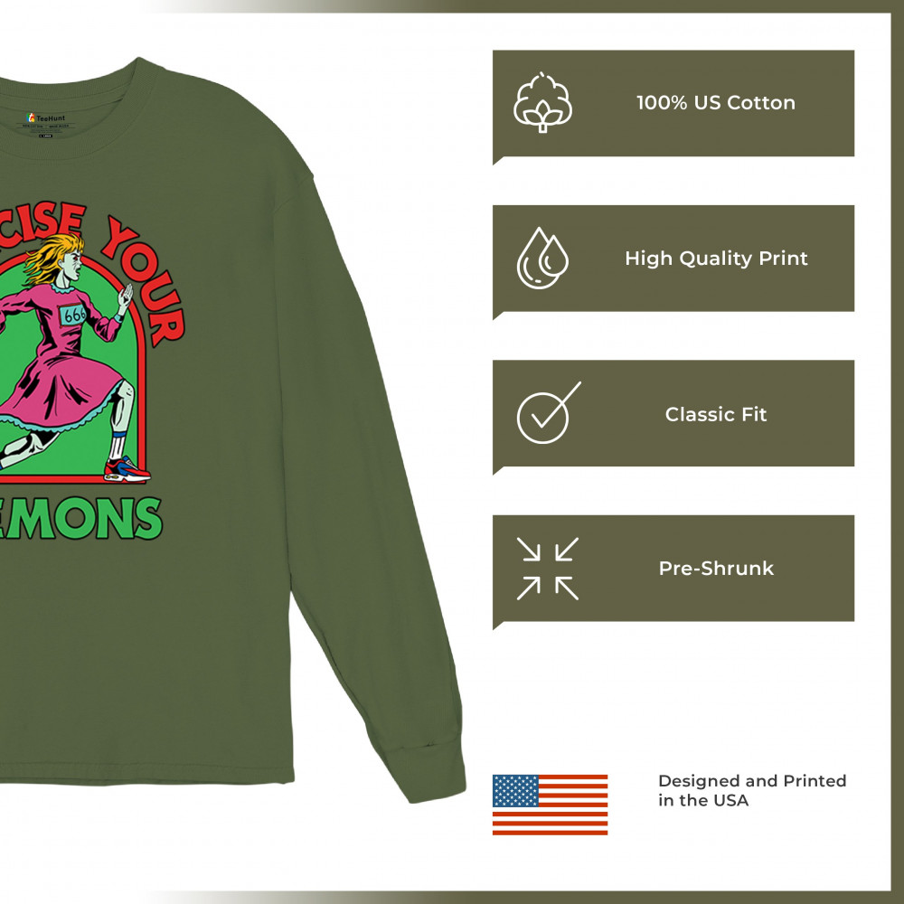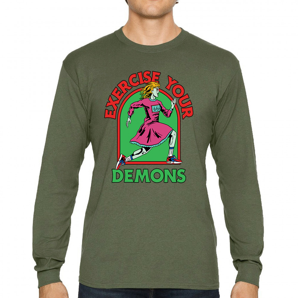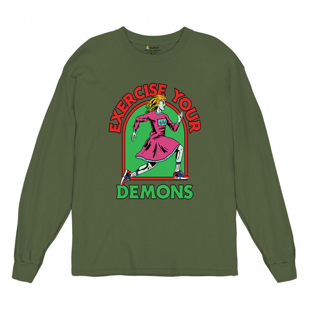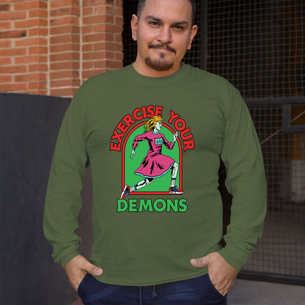 Exercise Your Demons shirt – funny halloween gym shirt with fitness humor, scary workout design, demon runner style, and spooky parody vibes.