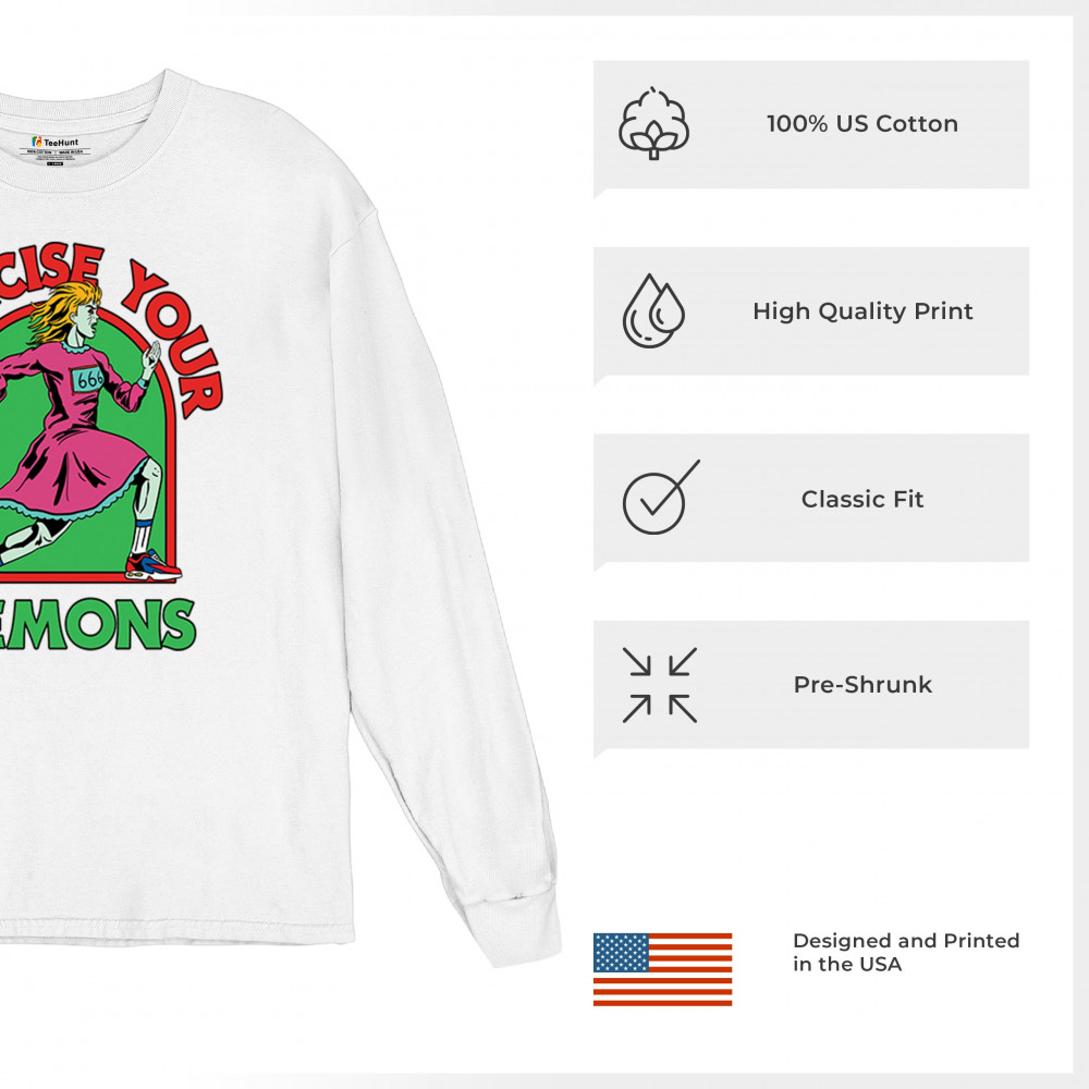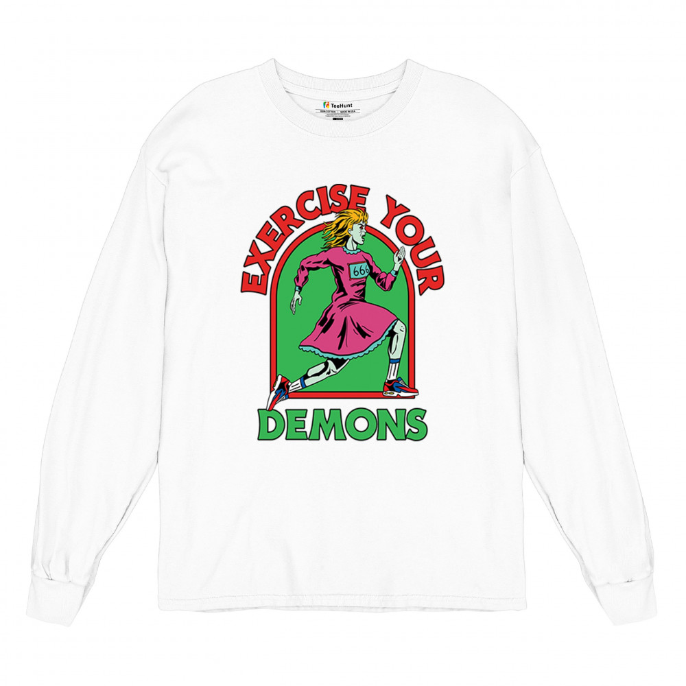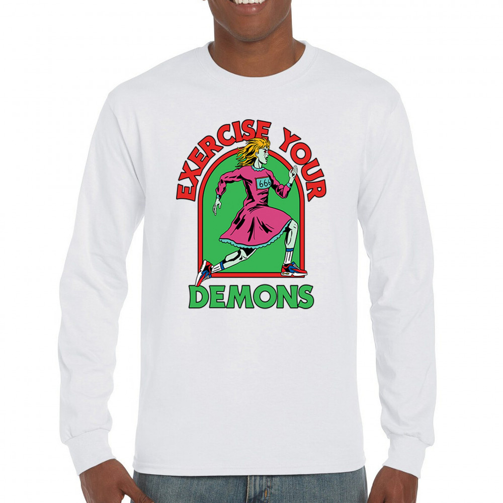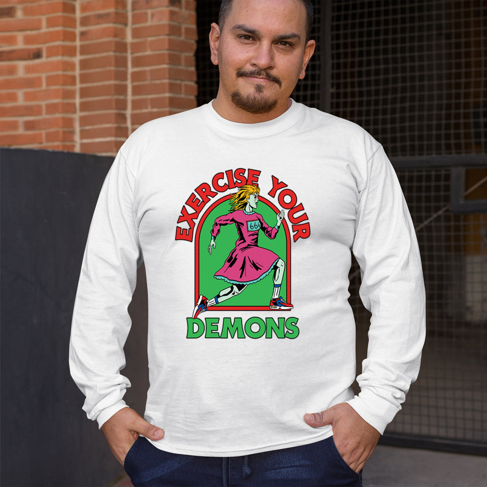 Exercise Your Demons shirt – funny halloween gym shirt with fitness humor, scary workout design, demon runner style, and spooky parody vibes.